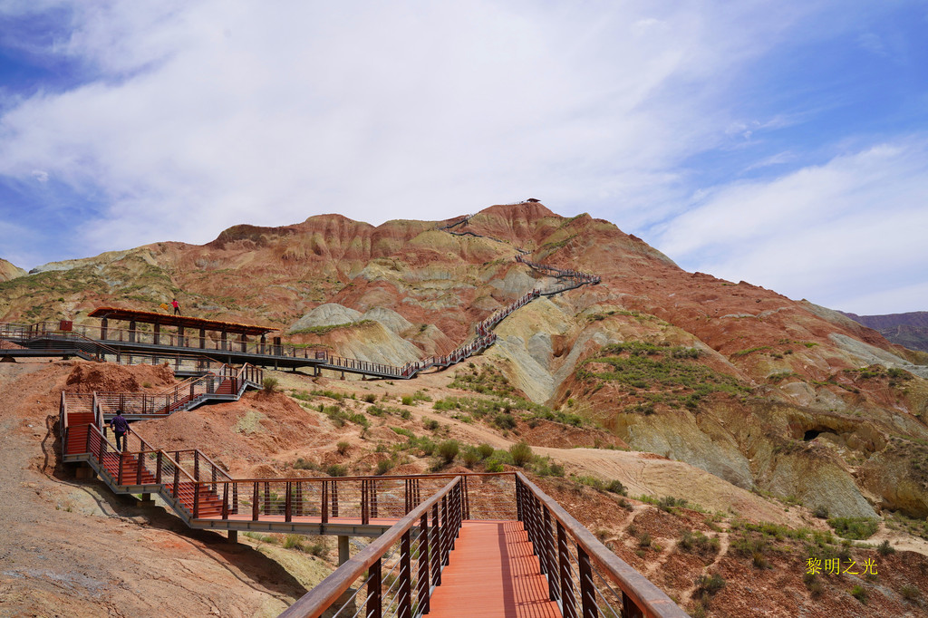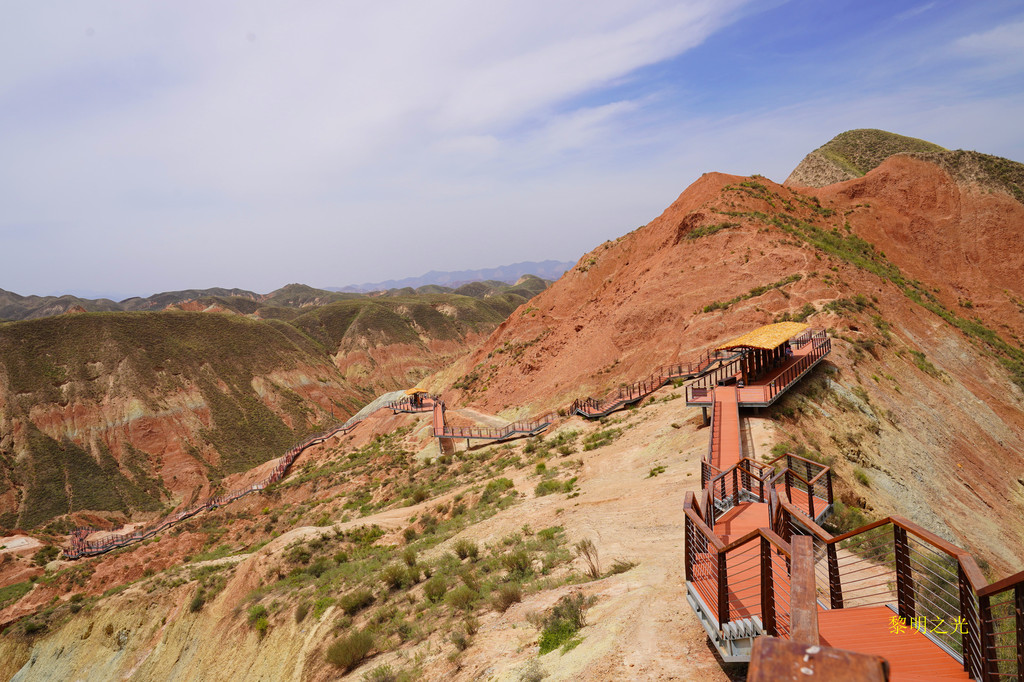 11:06我们乘电瓶车到达第三站沙韵驼铃,这里有全长2550米丹霞栈道,栈道依山就势,起伏蜿蜒,犹如盘踞于丹霞崖壁上的巨龙,十分壮观。沿栈道拾级而上,丹霞地貌秀美风光尽收眼底。今天天空晴朗、阳光明媚,蓝天白云下徒步在景区的栈道上,远眺、近观、横望、俯视,赤壁千仞,山峦叠嶂,彩色的地质奇观,在蓝天的映衬下显得更加艳丽夺目,美不胜收,仿佛感觉这里是上苍遗留在人间的“七彩调色板”奇妙无比、美轮美奂。栈道上有休息亭,凉风吹佛,景色绝佳,坐在凉亭上感觉非常的惬意。