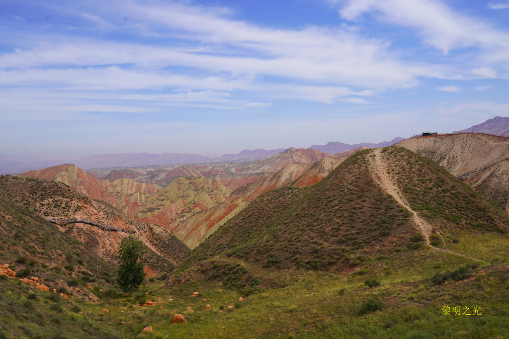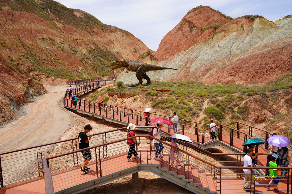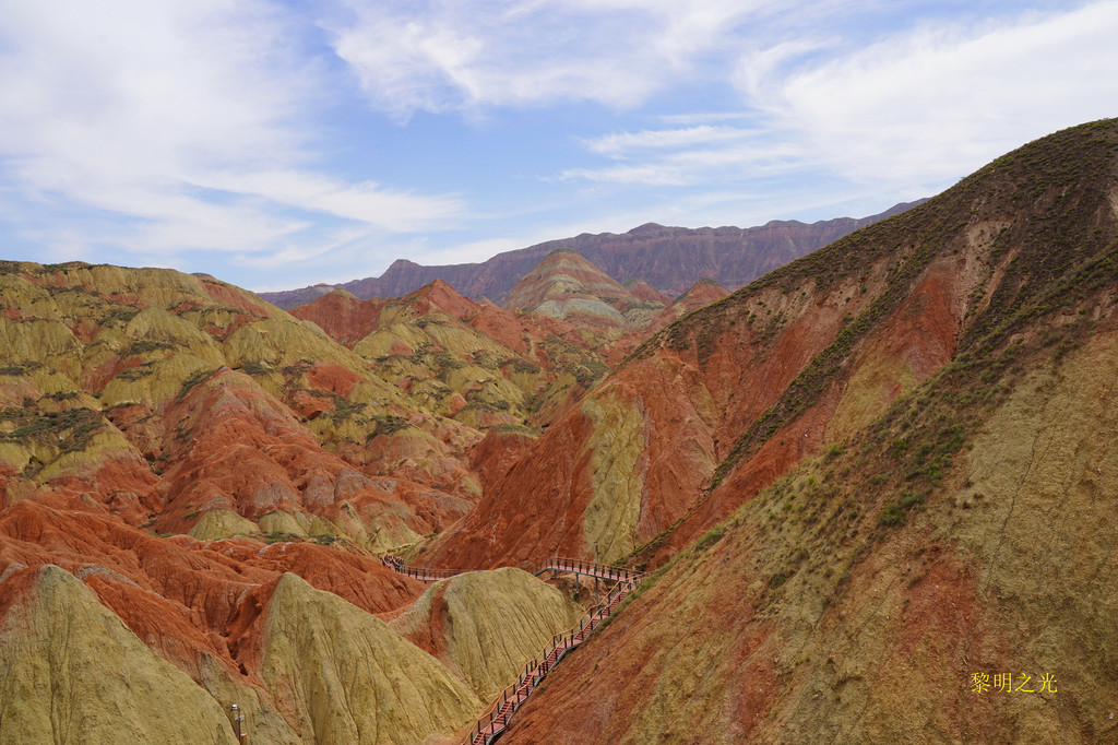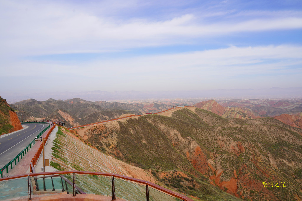 此处丹霞崖壁壮观雄浑,色彩斑斓,犹如跌落人间的彩虹,南北两侧地质差异很大。在震撼、惊叹的同时,让人感到了上苍创造的万能。有一条蜿蜒下行的长长栈道,直通丹霞群峰中,可惜没有开放。