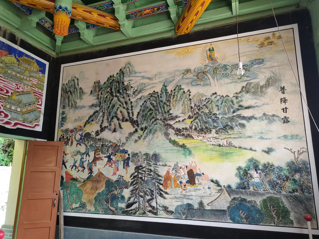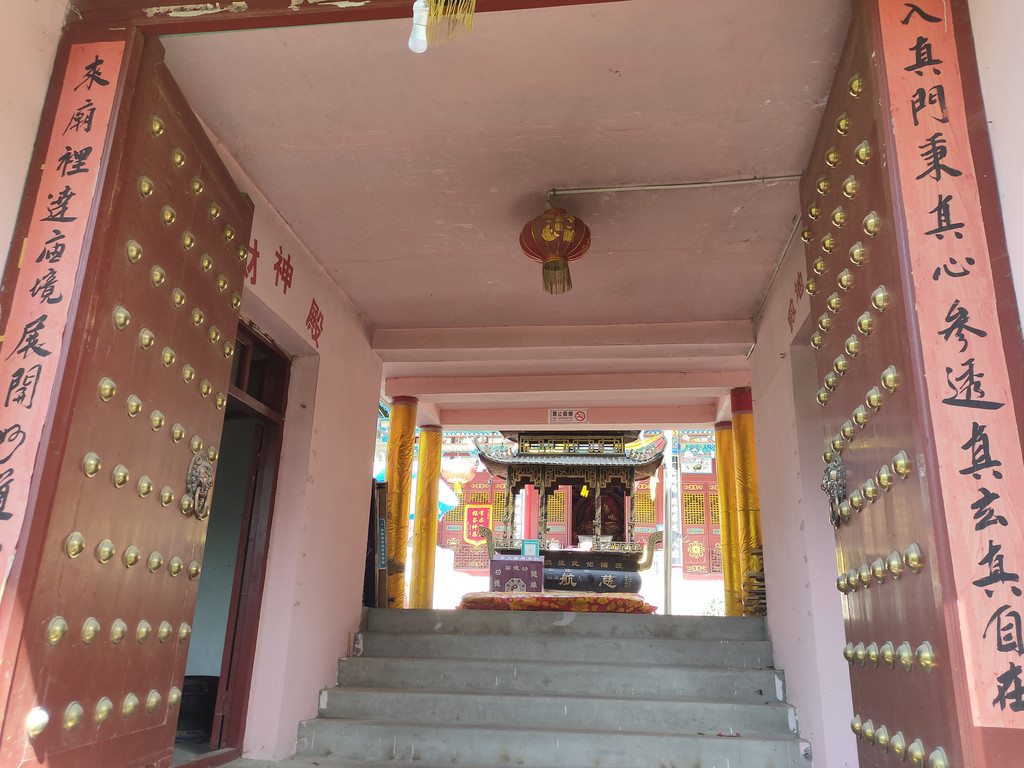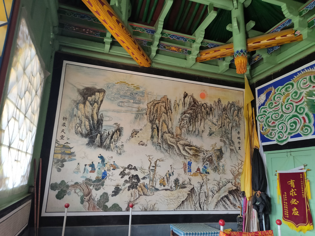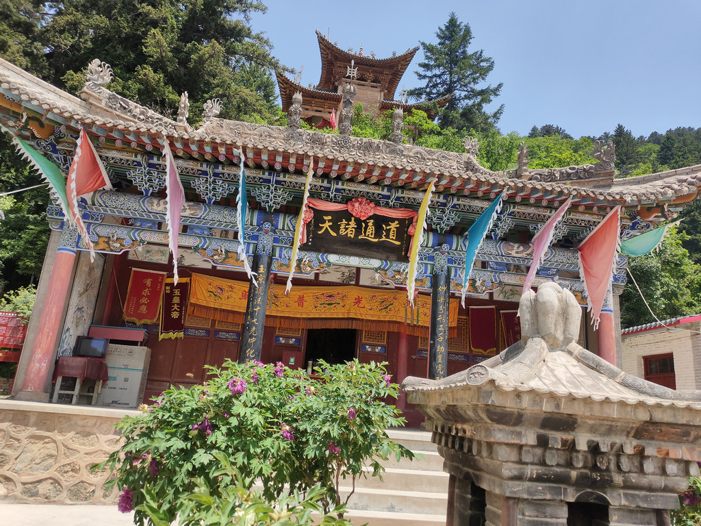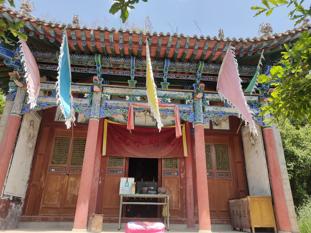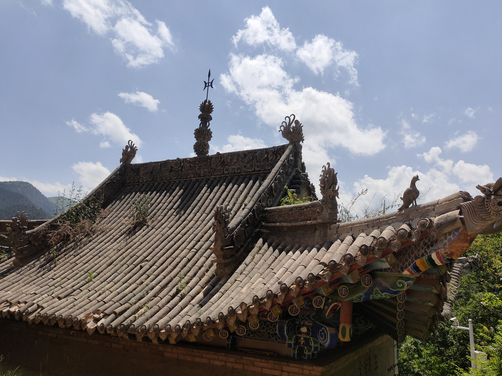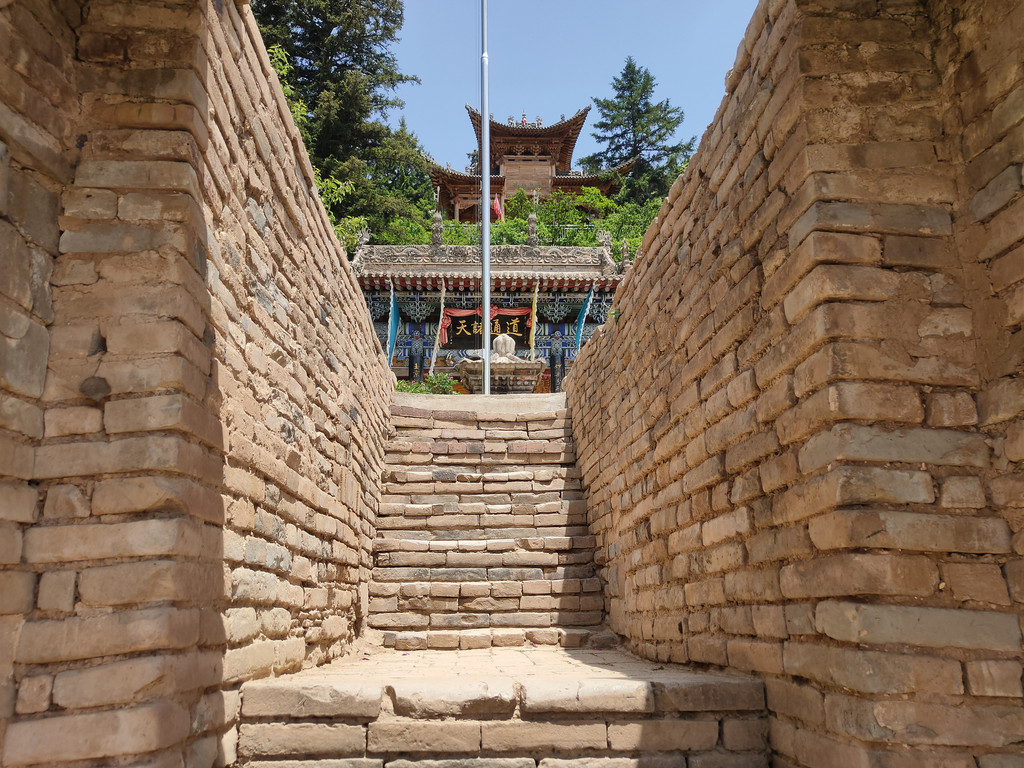 其实我们也没找着泉,倒是有一组殿宇。殿宇被称为老爷殿,初建年代不详。前面是关帝楼,内祀关羽坐像,两旁建陪楼,分别祀水、火二星像。楼前有看河亭,这里离黄河比较遥远,可能以前在这个角度是能看到黄河的吧?这里是榆中县的道教协会活动场所,原来的建筑在文革中被毁,现在我们看到的是1986年新修的。