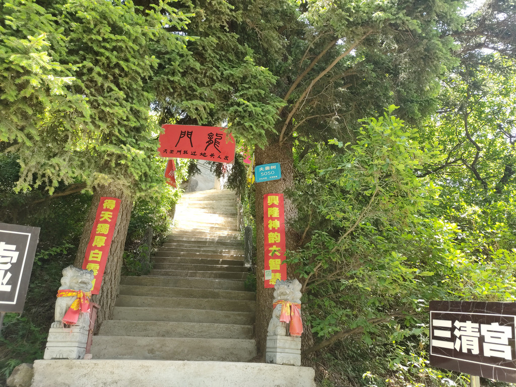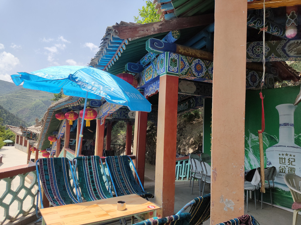 登上一条长长的台阶,是三官阁。不过这里如今是休闲茶座之类的营业场所,前方倒是很开阔的观景台,在这里可以一览群山。青山隐隐,倒与兰州其他的山大不相类,难怪是西北极其难得的保护区呢。
