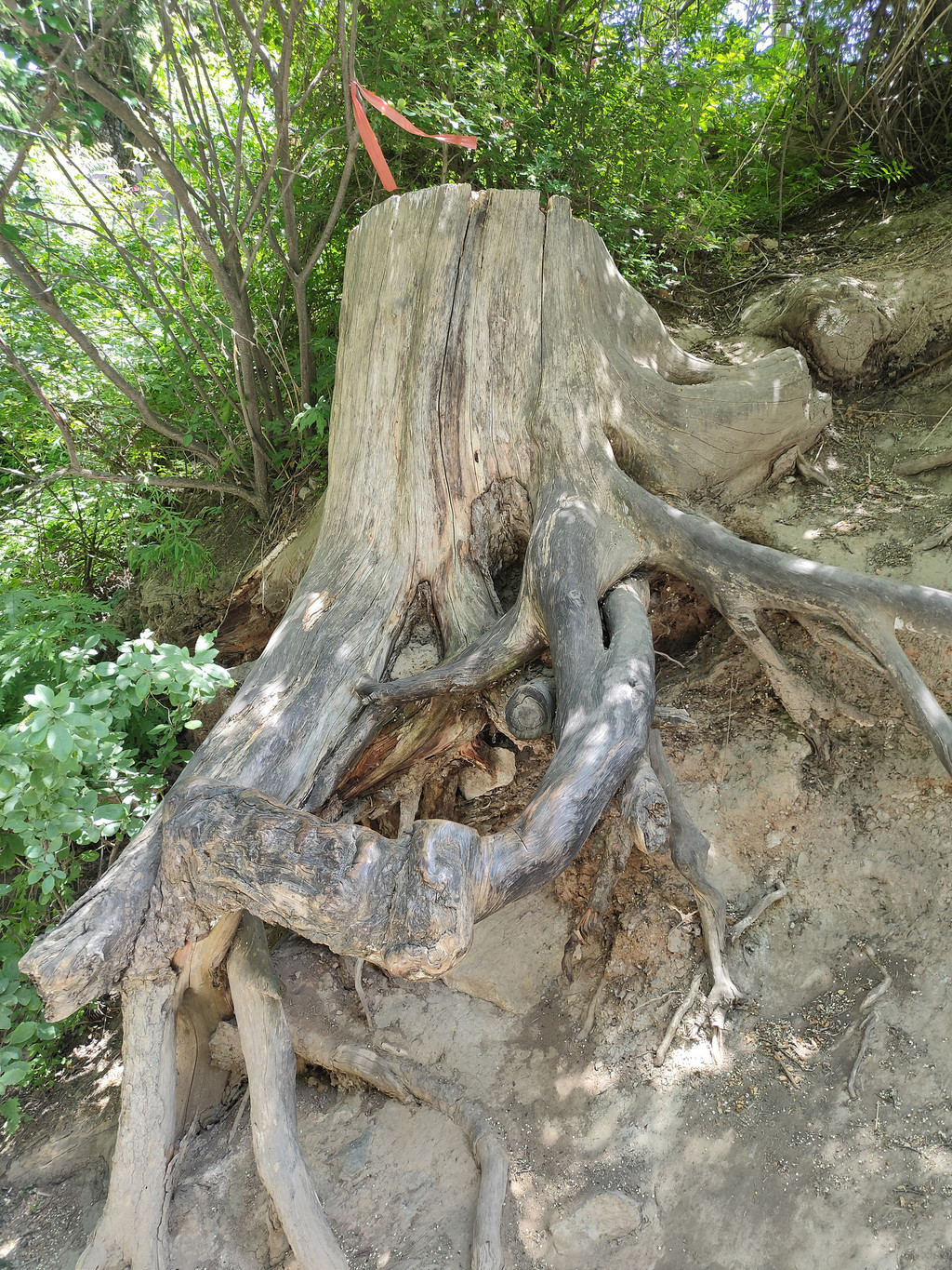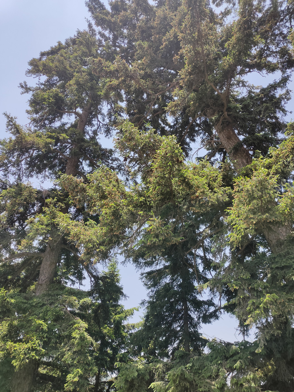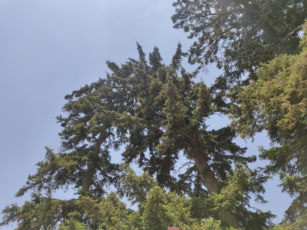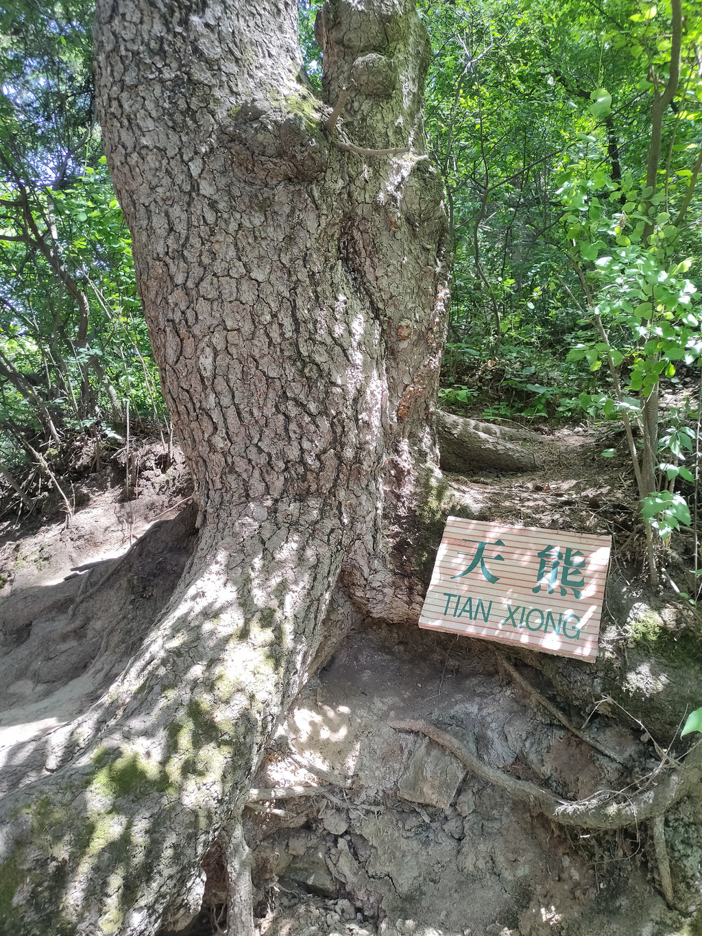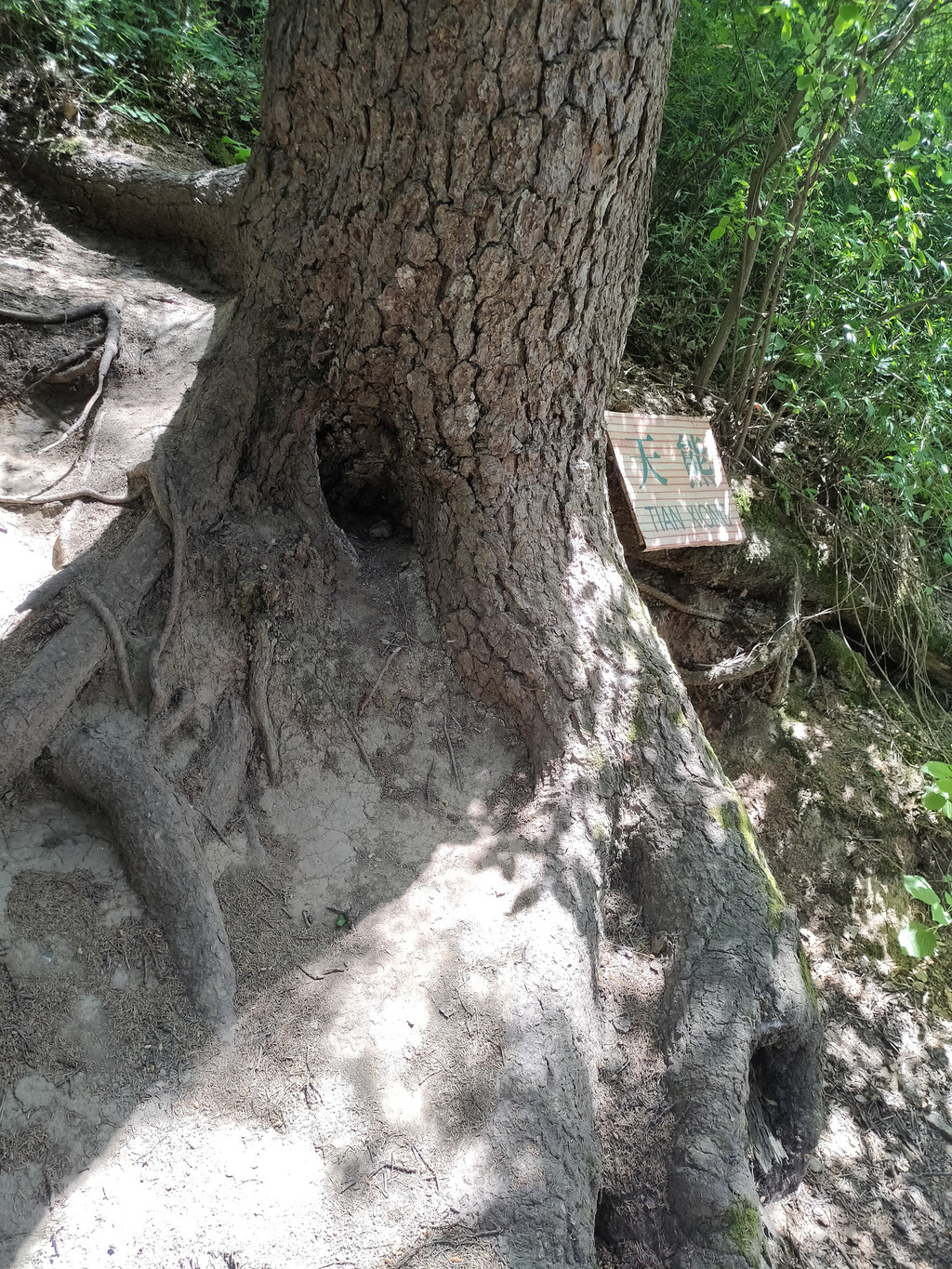 左侧有两株高大的云杉树,两树相交,被称为“爱情树”,当然也有一则故事。相传古时兴隆山下有一位叫凌白的富家少爷,偏偏爱上了一个叫月婵的贫家女。在故事里,大凡有个好听名字的女子,相貌总不会差的。两人陷入热恋,无奈家世相差太远,旁人总觉得月嫌是贪图钱财勾引凌白,月婵也是个有心气的女孩,便想结束这段感情,免得惹人闲言碎语。凌白为了表示真心,就带她前往兴隆山上的神树前许下爱情的诺言。神树为了考验他们的感,让两人经历了贫穷、疾病等种种磨难。无奈两人情比金坚,不管遇到了多少艰难困苦,依然相亲相爱,不离不弃。神树也被他们的爱情打动,护佑两人度过了幸福的一生。百年后,神树把两人点化成了两颗云杉树,依然根连着根枝连着枝,两树交叉生长,形成一个“心”形,向世人诏示着美丽的爱情故事。说实在的,我们仰着头把脖子都看酸了,也没能看出一个完整的心形来,只能默默意会一番。当然,也有可能我们观察的角度不对。