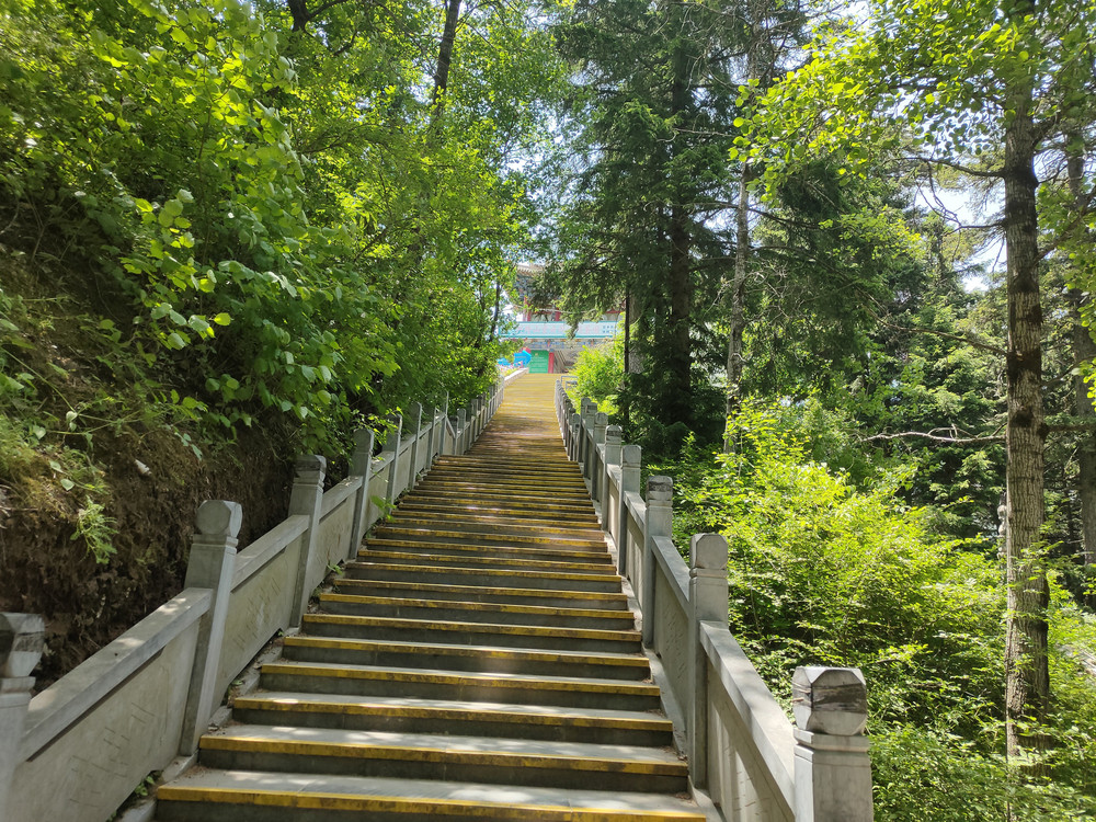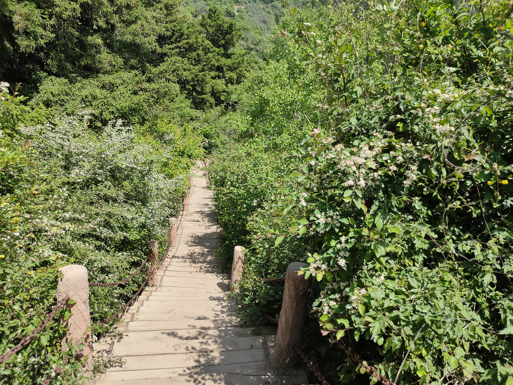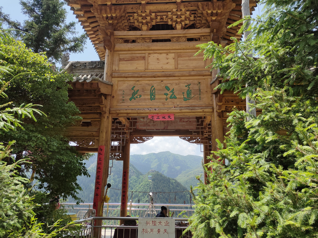 殿旁是木栈道,这是连接兴隆山东山与莲花峰景区的主要通道,全长1200米,平均道宽1.5米。原来我以为这条栈道是有点历史的,不想竟然是2010年才开工建设的,全程采用钢筋混凝土路面选用优质红松木经过防腐烂和防潮湿处理,开创了甘肃省室外木栈道的先河,看起来造价不菲。