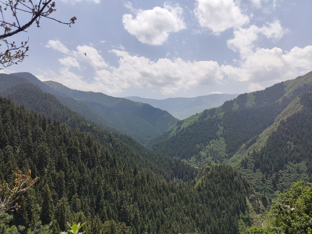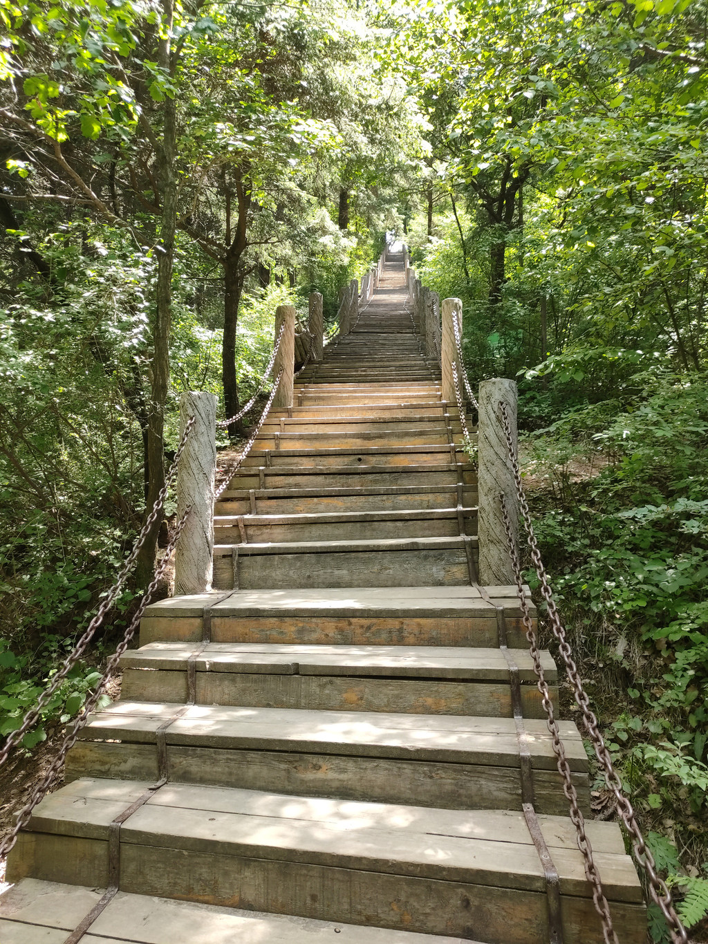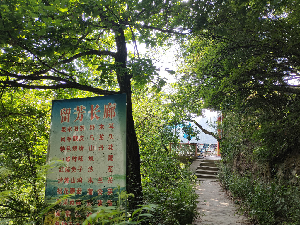 原以为不过1200米的栈道,以我们的体力应该不在话下。谁知道这段山路缓急有别,从东山之峰至莲花峰,不啻于先下山再登山,栈道有几段还颇陡峭,兼有炽烈的阳光,很多地方的树木不够茂盛,路旁看到一个亭子,便忍不住小憩片刻。