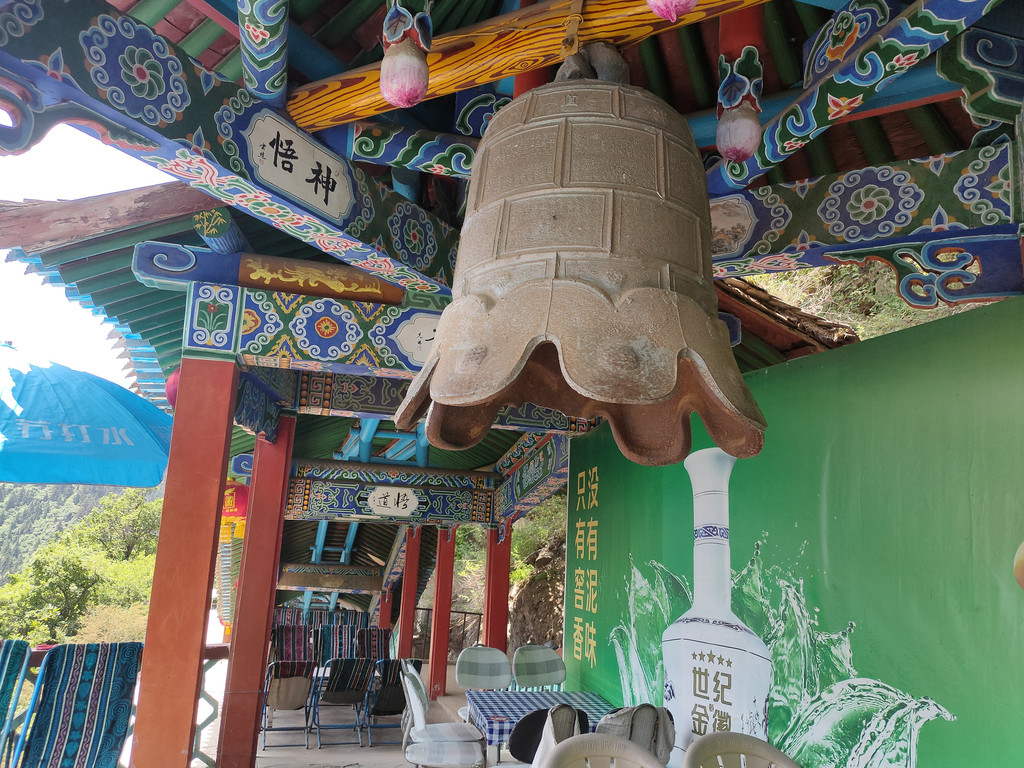 旁边是登山的台阶,沿着台阶还修了一段长廊,却也是休闲茶座,不过并没有什么客人。廊有亭,悬着一只铜钟。