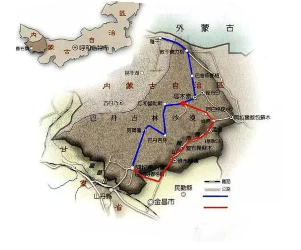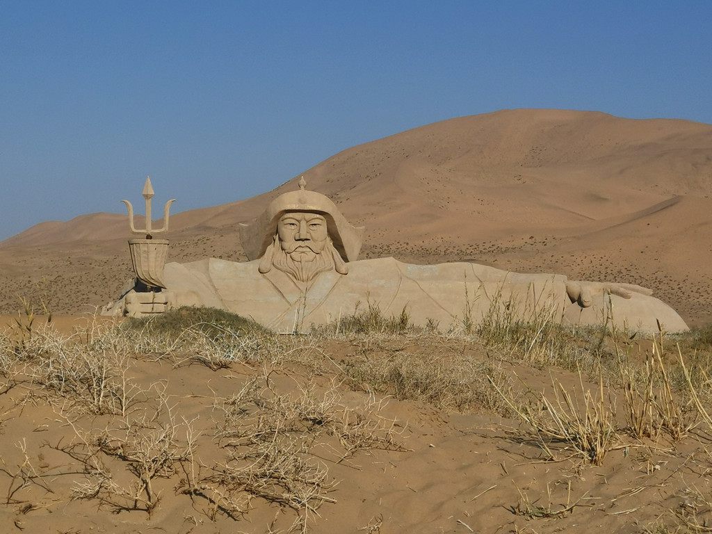 那个景点,也是一条漫漫弯曲长路。从公元大门口出发,中巴沿着一条沙尘满布的天然沙路,颠颠簸簸,摇摇晃晃,车过之处扬起一路沙尘。中巴行进了40分钟,在路标的21公里处,看到了巴丹沙漠中的两处湖光水影。那就是紧靠成吉思汗雕像的巴丹咸淡两湖,小湖东边,则是绵延不绝的鸣沙山丘,好一副大漠风光。一张沙漠导游图告知,音德日图的神泉,那才是这个大沙漠的神妙之处。那里有咸水湖中涌出的天然矿泉水,历代君王的御用圣水之泉呢。不过,你看看地图就知,那个地方,可不是21公里的路程,小车至少得200公里才可到达。