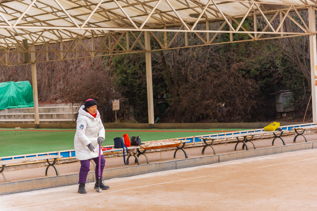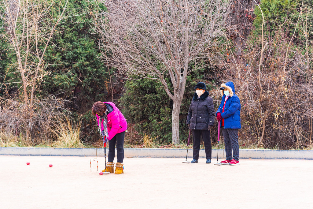 我在黄河边上看到了一个很有意思的场景,一群叔叔阿姨在玩一种类似冰球的游戏。不过是在沙地上面,球大小和材质看起来就跟台球差不多。