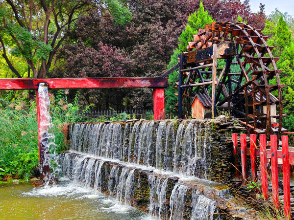 走进园内,人们便被那排列整齐的古老水车所吸引。这些水车形态各异,有的高大威猛,有的小巧玲珑,它们仿佛在诉说着古老的故事。水车在水流的推动下缓缓转动,发出嘎吱嘎吱的声音,让人仿佛穿越回了过去,感受到了古人的智慧与勤劳。
