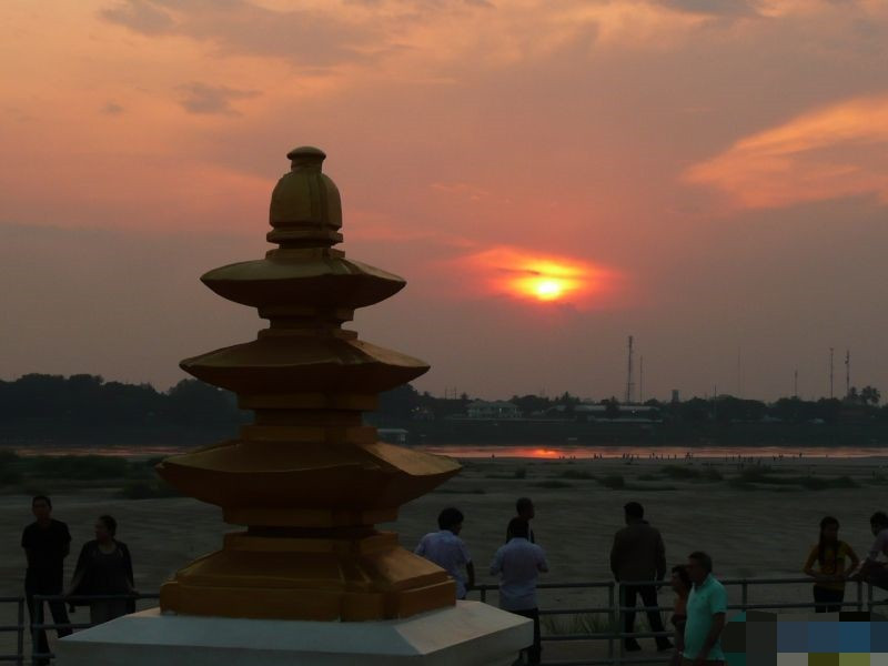 晚上去湄公河边赏日落,坐在河堤上,看着夕阳静静地从河对岸的泰国廊开落下。人们在大堤上悠然自得地散步,小孩子在奔跑玩耍,情人们在悄悄私语,一派平静与安祥。