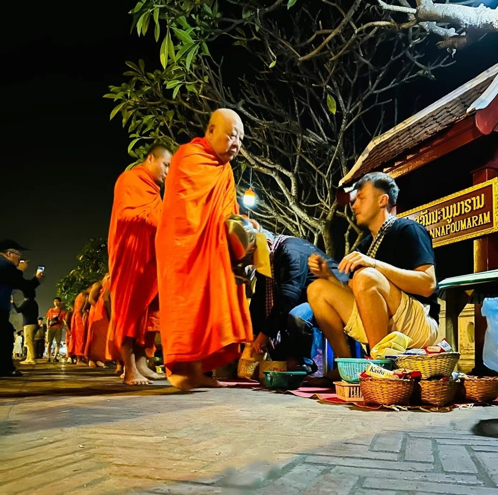 在琅勃拉邦 ,传承了数百年的还有每天在洋人街、迈佛寺等多个区域的化缘与布施活动。早上六点左右,日出之前,僧侣们不分长幼,列队接受来自五湖四海游客和当地信众们的虔诚布施,传统庄重,极具仪式感。