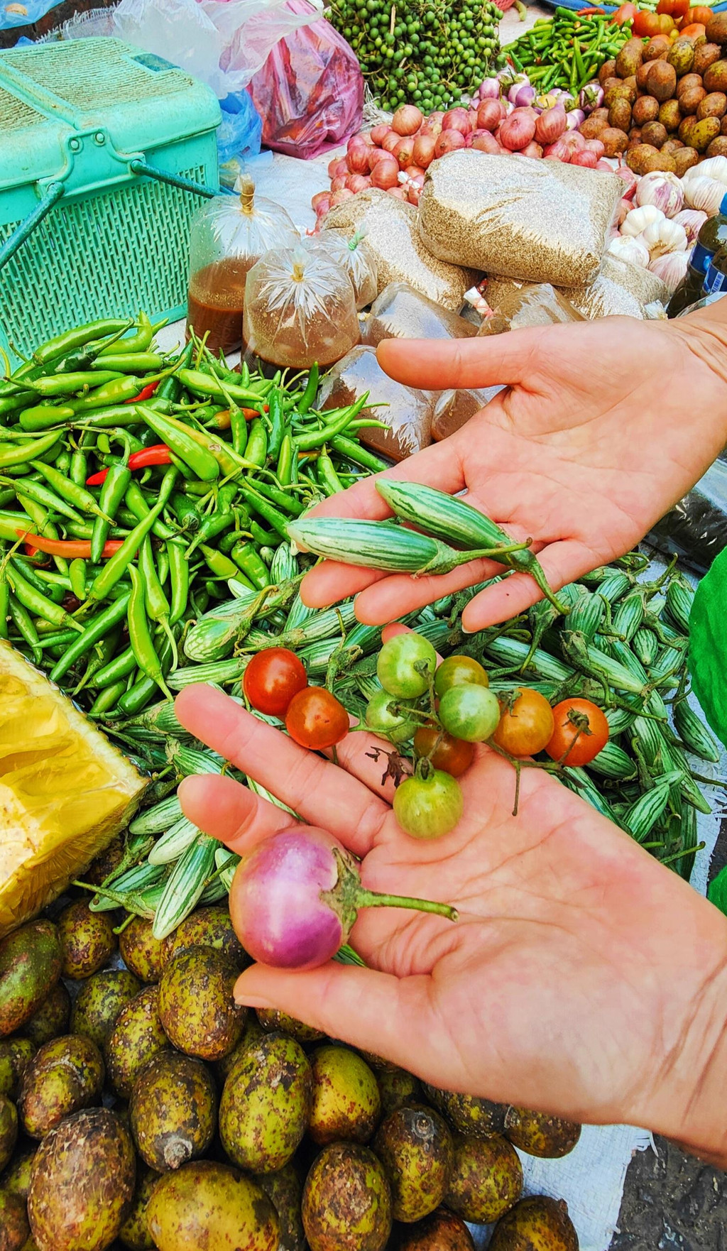 湄公河与南康河在琅勃拉邦交汇,造就了丰富的物产,热带水果自不必说,市场上随时可见几十斤重的叫不出名字的湄公河鱼。这里盛产香糯米,大米不比著名的TAI米差。蔬菜瓜果琳琅满目。特别是当你亲眼见到这些手指般袖珍的茄子和枸杞一样大小的小米椒,你不仅会怀疑采摘者的耐心,还会激发你亲口品尝的欲望。果真世界之大,无奇不有。