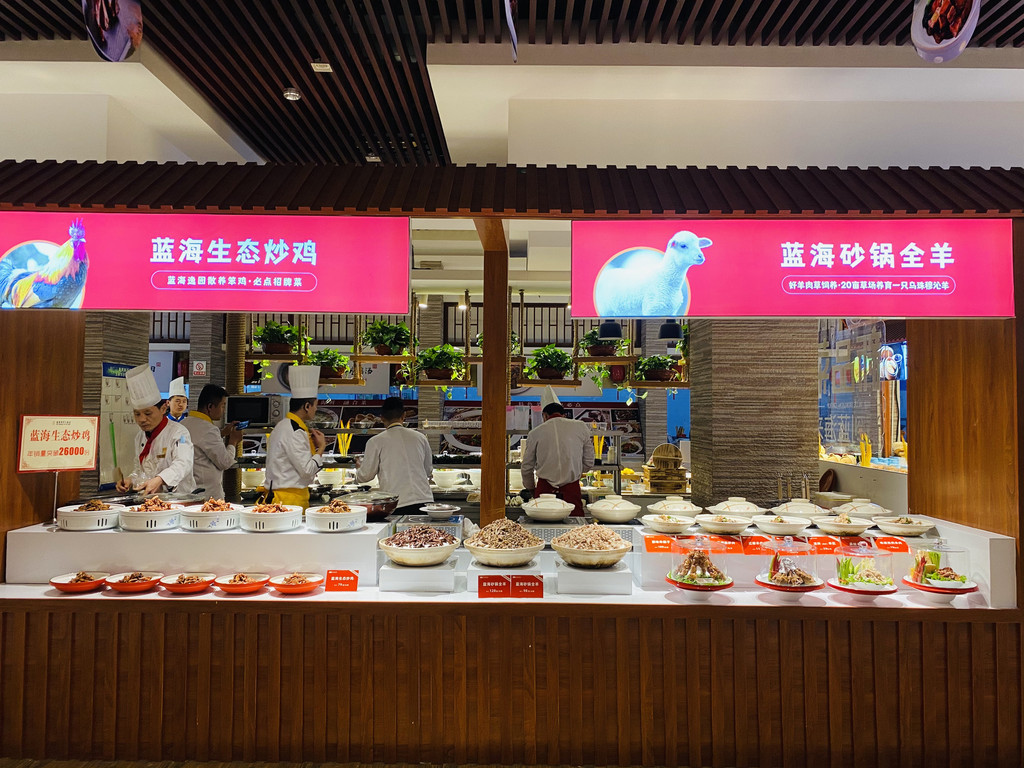 渔歌舫是蓝海酒店集团中低端餐饮品牌,房间以"渔歌唱晚”所命名,装饰风格简洁大方,经营菜品以胶东时令海鲜和地方风味菜为主,目前有四大名厨名菜,蓝海砂锅全羊,蓝海烤鸭, 蓝海生态炒鸡,雨花石焖牛肉,另有特色酱猪蹄,果木烤乳鸽,小龙虾水饺等特色菜品,深受大家喜爱,星级服务,大众消费", 共有37个包间,小至4、5人,大到25人的用餐均能满足,是品海鲜,享美食,聚朋友的理想聚会场所。