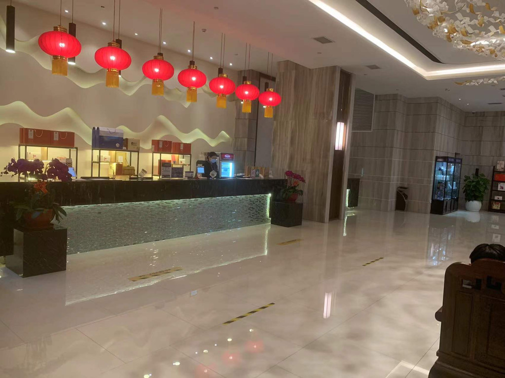 进门就是服务人员的热情问候,以及对疫情的严格管控,每个人都可以做到一人一码一口罩。抬头就能看见大堂的水晶灯,照的周围明闪闪。