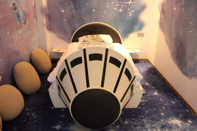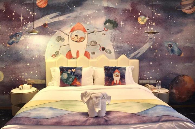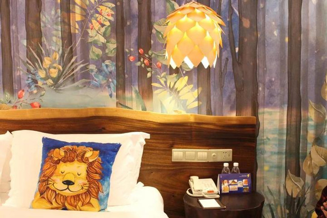 太空床、小木屋、丛林桌椅……小悟与朋友们的冒险经历融入到悟啦啦的各种主题房间中。小悟还为孩子们准备好了《小悟奇妙之旅》的绘画本本,里面有他的48个奇妙冒险故事,扫描二维码可以在线听哟。