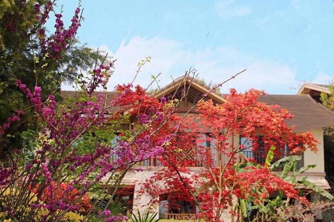 入住办理完毕之后,漫步园中,发现除了桃花,那还未落尽的枫叶依旧红艳,梨花也毫不逊色,洁白如雪,虽不娇艳,但在这蓝天映衬下格外柔美。在家待得久了,你应该也和我一样,更加倾心这满含花香的清新空气。