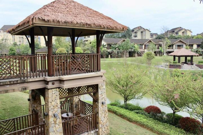 驷马屋是一栋四户的双层设计,每一户都有独立入户的楼梯。最喜欢的是那个向外延伸的独立角楼,早已与园景湖景融为一体。角楼楼顶是返璞归真的茅草,颇有几分隐逸的闲趣。