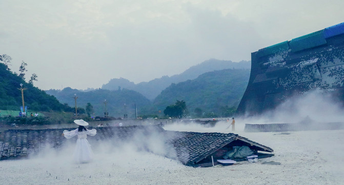 进入剧场,首先是来到“云之中”,云之中是一片开放的剧场,仿佛仙境。一大片的白色砾石里安装了雾森装置,整个剧场被云雾覆盖,王导是把峨眉山上的云海都搬到了剧场吧。