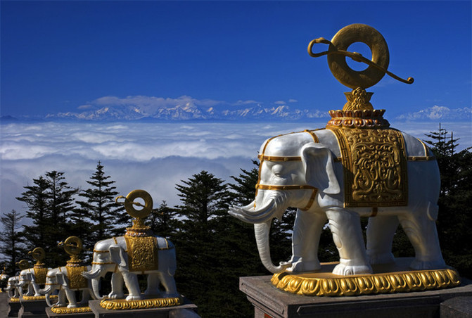说到峨眉山让我想起了李白的诗“峨眉山月半轮秋,影入平羌江水流。夜发清溪向三峡,思君不见下渝州。”清晨的峨眉山,雾从山谷里升起来,整个树林都浸在乳白色的浓雾里。一片云海出现在眼前,慢慢地太阳出来了,千万缕像利剑一样的金光,穿过树梢,照射在峨眉山上,闪闪发光,美丽极了。峨眉山离成都一小时车程,这次从成都出发前往峨眉山,一直念念不忘的峨眉山终于来了。