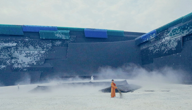 《只有峨眉山》戏剧幻城,创下了好几个“第一”,第一个戏剧幻城,第一个实景村落剧场,第一个卍字舞台等等。单从剧场建筑外立面来说,就运用了50万片灰色陶瓦和彩色玻璃瓦意在勾勒出一幅壮丽浩大的“千里江山图”。真真是大手笔呀!