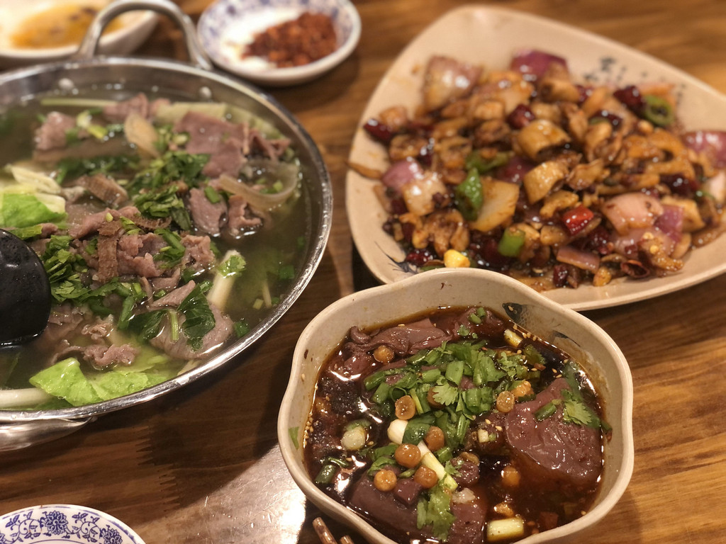 古真记的名气在乐山数一数二。钵钵鸡分红油和藤椒口味,菜品和肉类提前串好,浸泡在调料丰富的汤汁里,吃一口就是满满的幸福感。