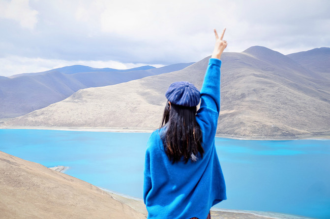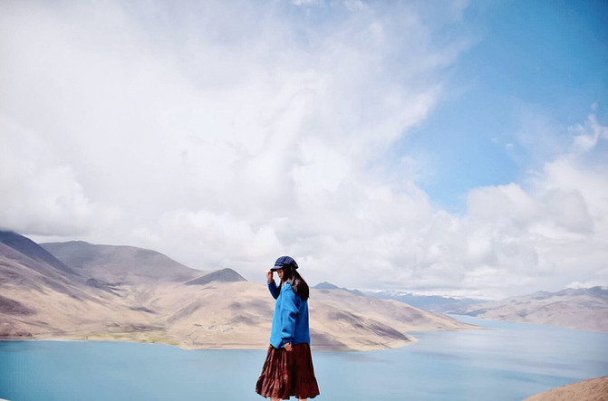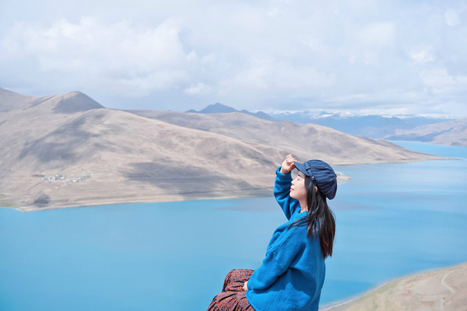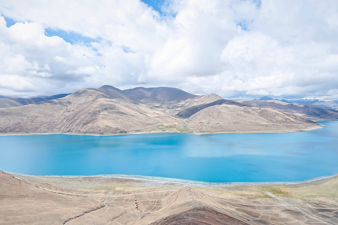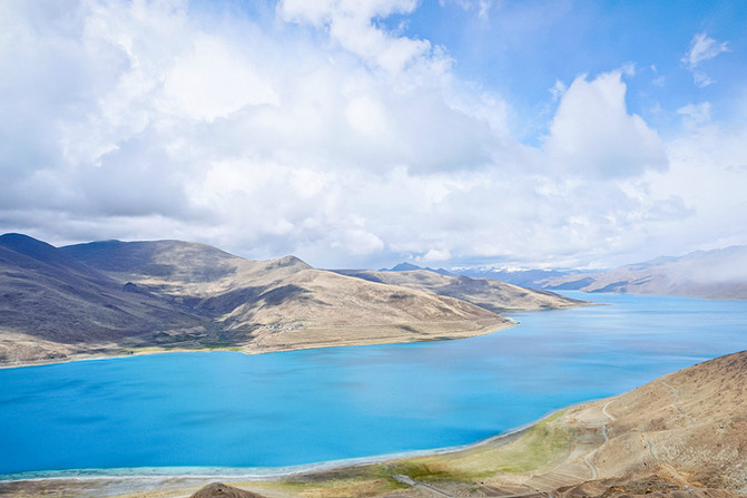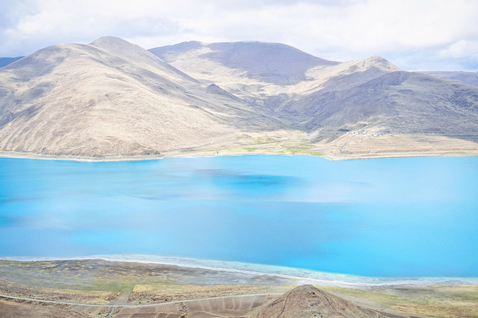 来到其中的一处观景台,俯瞰羊湖,湖面平静,一片翠蓝,仿如山南高原上的蓝宝石,它的美是温柔动人的。