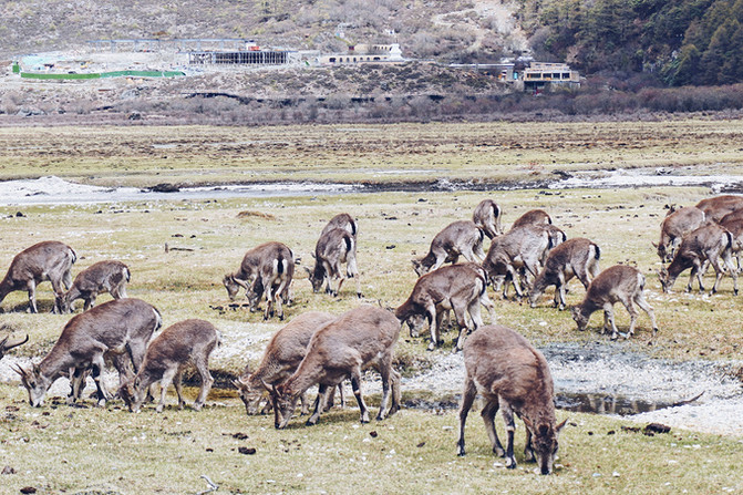 在返程到洛绒牛场,只见一群牛羊、麋鹿...安静地在草地上享受着阳光和绿草,远处是静谧的雪山,构成了一幅原始又迷人的画面,让人心旷神怡!