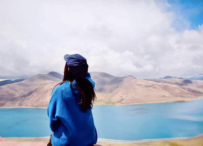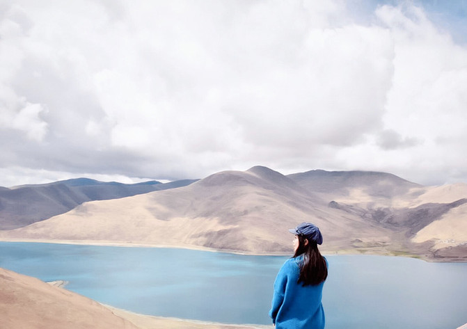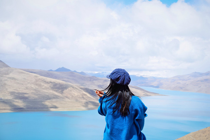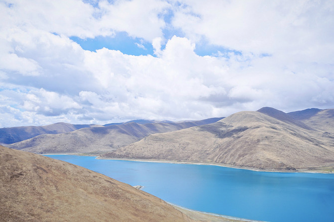 从拉萨市区过去,大约3小时的车程,车子在山间盘旋,窗外的风景如诗如画,透过车窗看到的羊卓雍措,绵延的群山和飘渺的云彩,以及那一汪像宝石蓝一样的湖水,再次见到,还是被它惊艳到了,忍不住透过车窗拍下眼前这一个如此动人的画面。