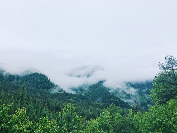 遇上阴天的天路十八弯,放眼远眺,云雾缭绕,苍翠的云杉下就是天路十八弯,别有一番意境。