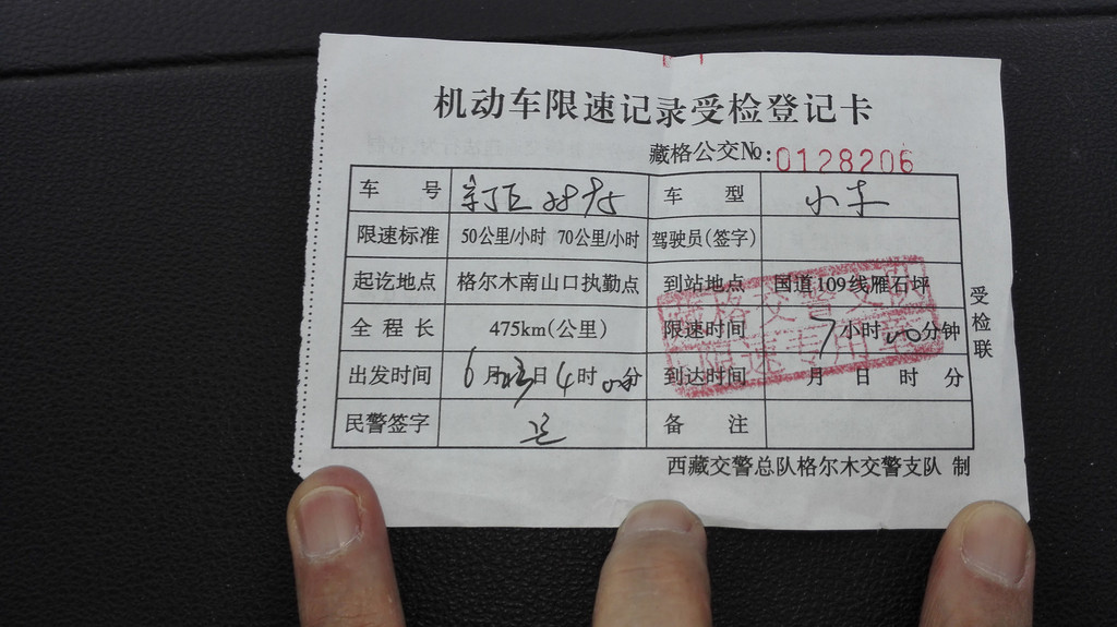 过唐古拉兵站,17:00安多检查站换路条,傍晚时分到了那曲,高反越来越强烈,头痛欲裂脖颈儿僵硬,一路上的愉悦变成煎熬。试下来什么藏红花、增氧药、吸氧等措施都不如吃止痛片有效,坚持前行,换限速单,沿途盖章。那曲是交通枢纽,大货车很多还赶上修路,到底当天没能赶到拉萨,次日凌晨两点才到,入住全季酒店。从北京到拉萨我们行驶了3670公里,平均油耗7.6升,2.5排量可是够省油。