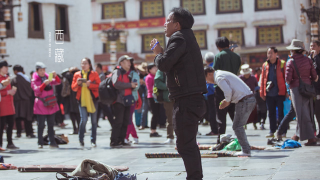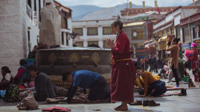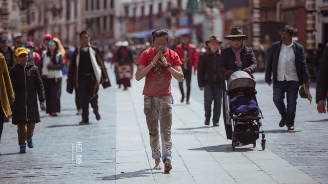 大街上人来人往,虔诚的朝圣者沿着街道顺时针磕着长头,满身灰尘,裤子已不知磕破了几条口,额头上已经被磕出老茧,依然一圈一圈的记录着他们的信仰。