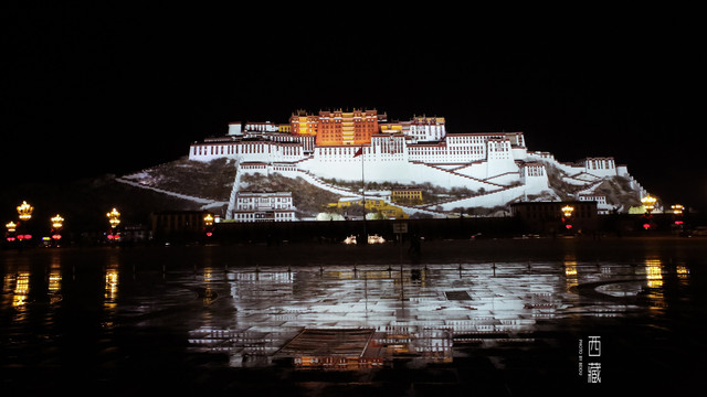吃完饭后我们再一次来到布达拉宫广场,还没有见过夜晚的布达拉宫,为了不让旅程留遗憾,大家一致决定一定要来看看。刚下过一场雨后,广场地上还有些积水,正好能拍到夜晚的倒影。每个人都好满足的回了酒店。