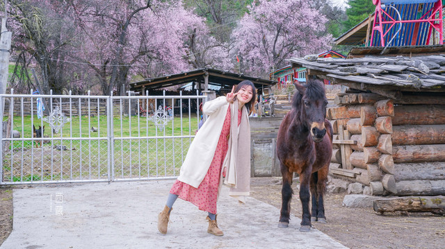 这里的桃花不似之前看过的那样矮小,反而挺高大的。两旁高大的桃花树形成了一条桃花长廊,低矮的红白相间的围墙让这里多了一丝藏域风情,藏香猪沿着围墙找着食物,这里的一切都是那么和谐。