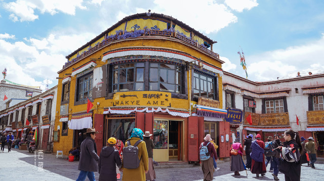 玛吉阿米也是这条街不可错过的打卡地,相传仓央嘉措就是在这里邂逅了“玛吉阿米”,很多游客都慕名而来。店铺门口的游客也是络绎不绝,想要拍一张没有人物的建筑照片更是难上加难。等了十几分钟之后,只好匆匆拍一张到此一游照片便离去。