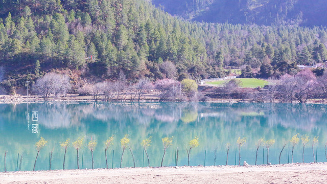 沿着山路走,对岸也是成片的桃花林,雪山倒映在碧绿的水中,世外桃源大概就是这番景象了。