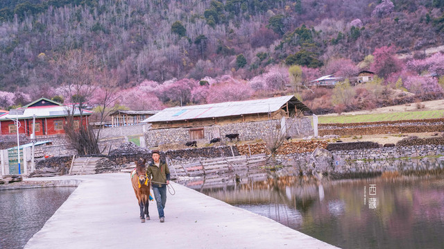 这里最出名的大概就是连接池塘两岸的这条小道,每天傍晚都会有牦牛成群结队的经过,周边全是桃花树,站在许木鱼庄的小木屋看过来,宛如仙境。当时好像也是为了这张照片而来,可是前一晚我们错过了最佳牦牛经过的时间,我们仨人都有些遗憾。清晨看到当地小哥牵着马经过,可惜的是我们也不在最佳的取景位置,只好匆匆拍了一张留作纪念。那就下次再去吧,虽然也不知道下次是多久。