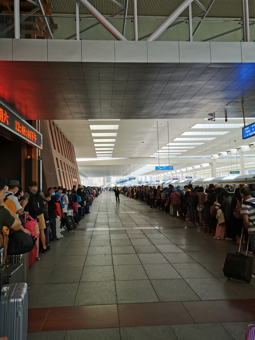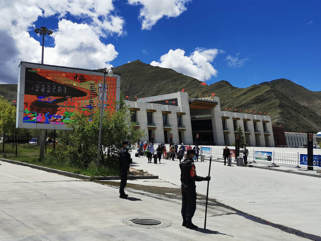 22日中午12点45分列车准时到达终点站——拉萨,刚刚熟悉起来的同车旅客互相道别开始各自的旅程吗,高亢的《青藏高原》在站台上回荡,瓦蓝的天低低的云耀眼的阳光,一派京津冀地区不容易见到的模样。我深吸一口气,细细体会这纯天然无污染的滋味,也许是心理作用,的确感觉到一丝甜味。按照工作人员的要求,开始列队逐人查验健康码测体温,在这遥远的边陲,防疫政策执行的有板有眼,无不体现了着党的集中统一领导,也保证了大家的身体健康。趁着排队等待的功夫,分别给几位至亲家人视频报平安,同时也让他们感受一下拉萨的蓝天白云。至此,38个小时的列车之旅结束了。