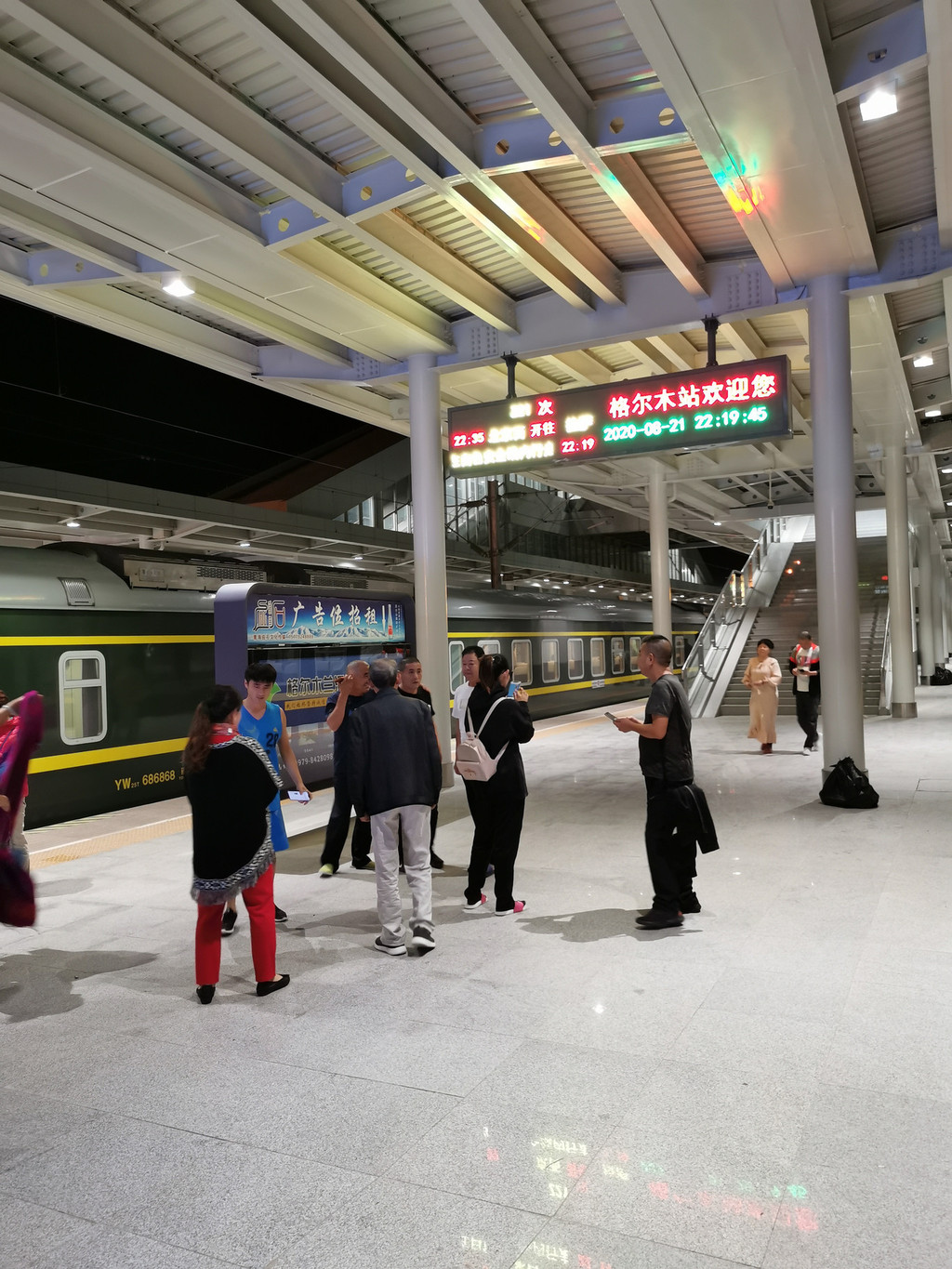 Z21次列车20点从北京西站出发,途径石家庄北、太原、中卫、兰州、西宁、德令哈、格尔木、那曲等8个车站,于第三天中午12:45分到达拉萨,运行时间40小时。从中卫到德令哈是在白天运行,可以尽情欣赏窗外不断变换的美景,并且除德令哈外每个站停车时间都在10分钟以上,可以下车活动活动。列车将于22点10分到达格尔木站。广播介绍说格尔木站才是青藏铁路的起点,从格尔木开始向南运行,穿越海拔5000多米的唐古拉山真正进入高海拔区间,因此在格尔木列车要再加上一个车头增加牵引力,并且列车车厢开始弥散式供氧,大家都打着盹儿等着到格尔木目睹伟大的青藏铁路首站的风采,同时也想亲眼看看带我们驰骋雪域高原的车头长得啥样子。