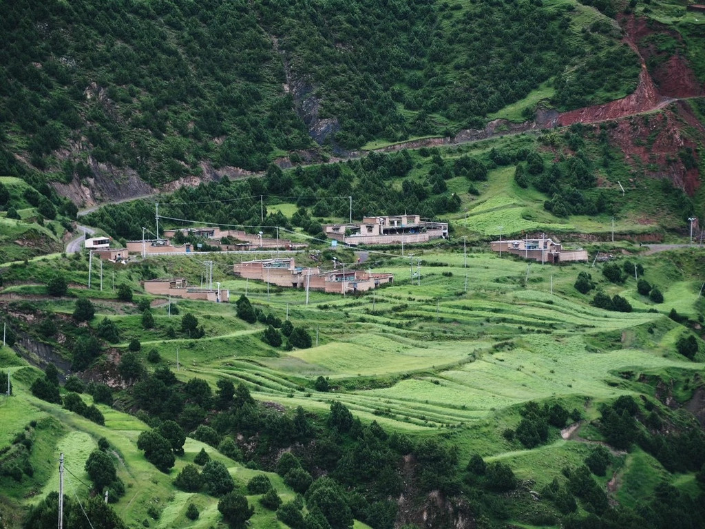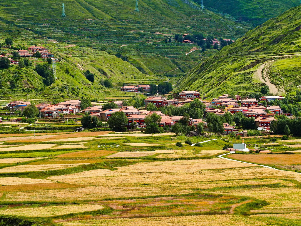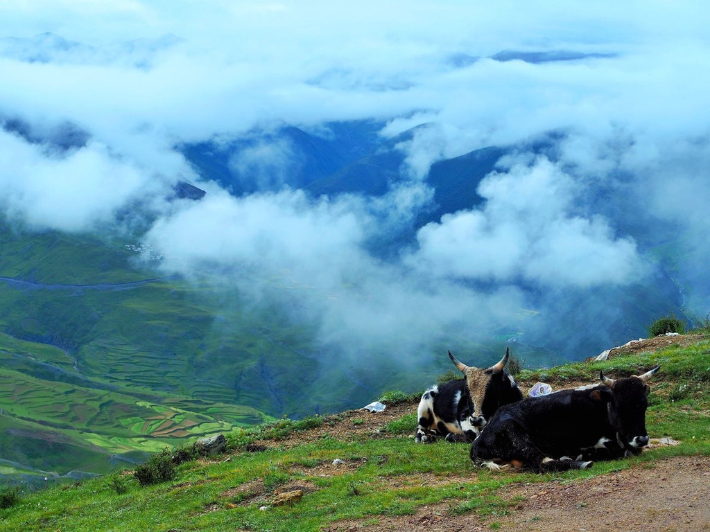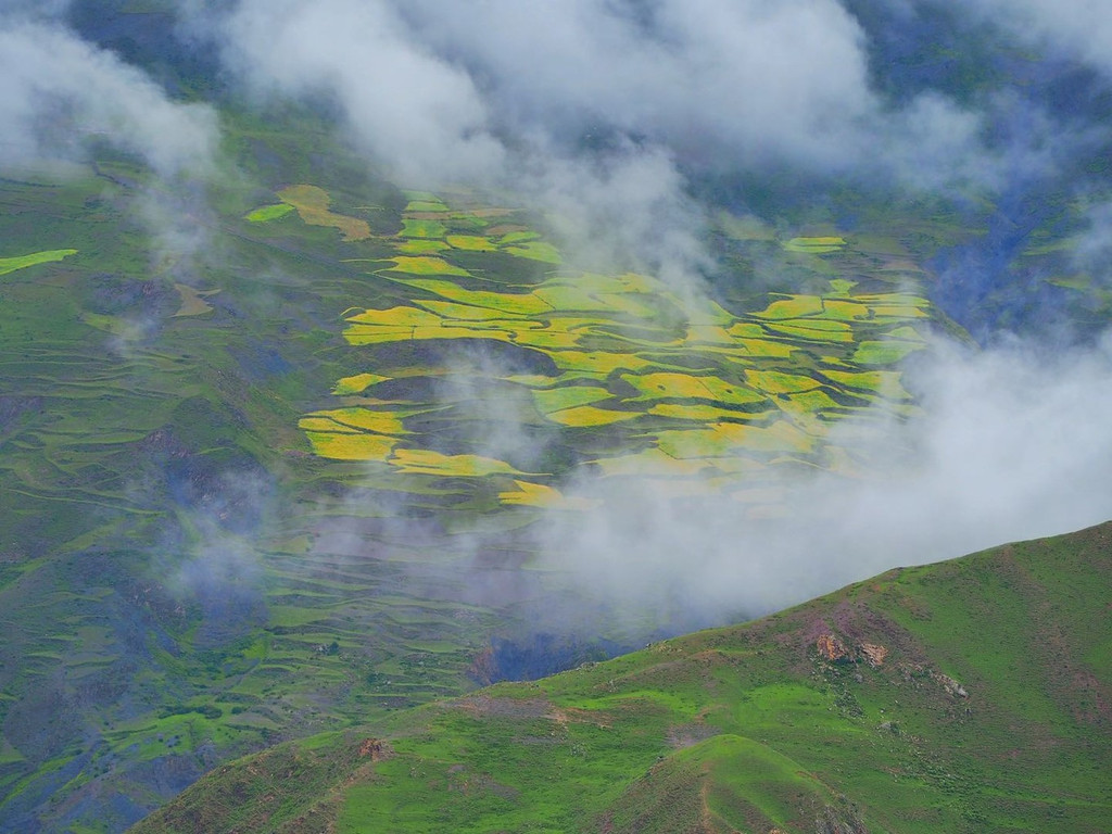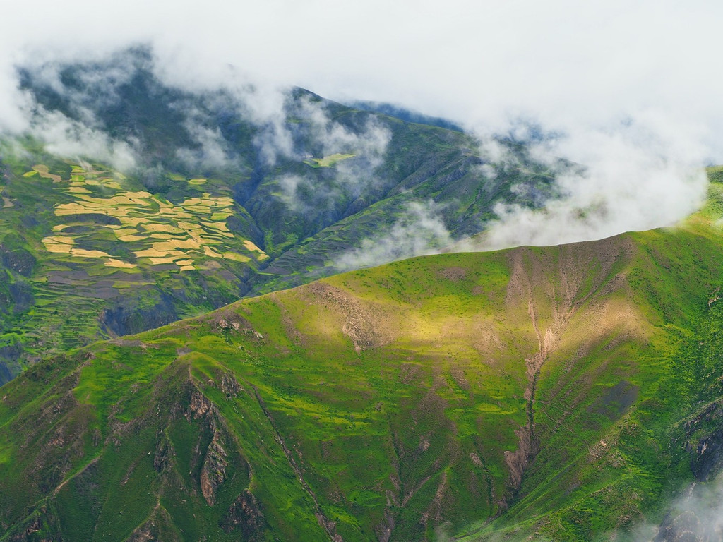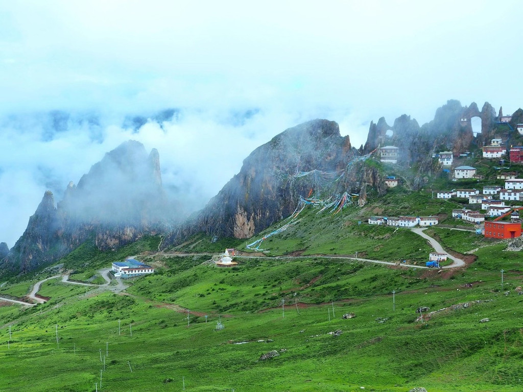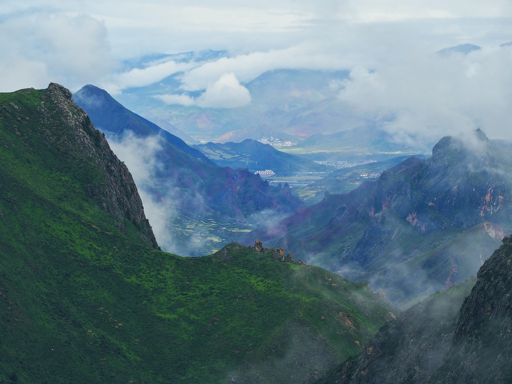在六峰之侧的另一边,有一座小孤寂的小山峰。山峰的后面是不测之渊,沿着悬崖边的草地一直前行,可以将远处如诗如画的小山村,静谧之景,尽收眼底。在云雾的深处,一座藏家村寨,青稞田层层叠叠,镶嵌在山水间,烟火正浓,与世无争。