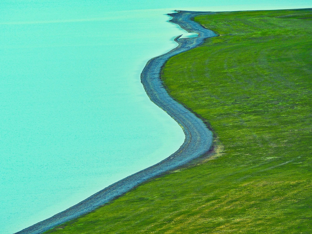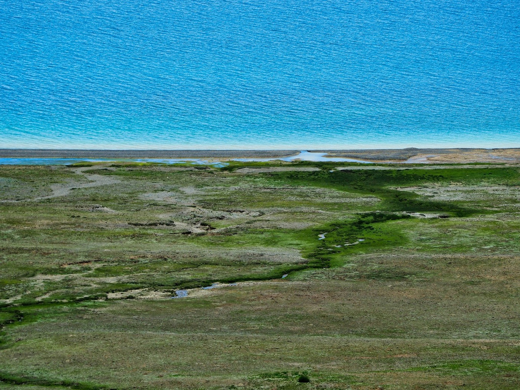 湖畔的戈壁上,有着斑驳瑟瑟的绿藻地,这是风雪留给大地最美的浅记。