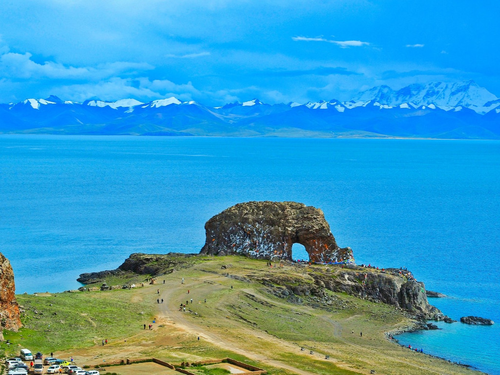 苍穹之下,天湖一色,经幡猎猎。碧湖之侧,怪石罗列,雪山绵延。一撇惊鸿,再见倾心……一座形如巨象的圣石,屹立在 纳木错 北岸。而石象中的天门大开,像是在窥探 纳木错 。圣洁的雪山、纯净的湖水、奇特的圣石,构成了天地间最唯美的画面,每一帧都令人难以忘却。