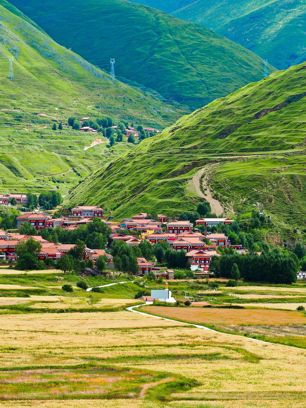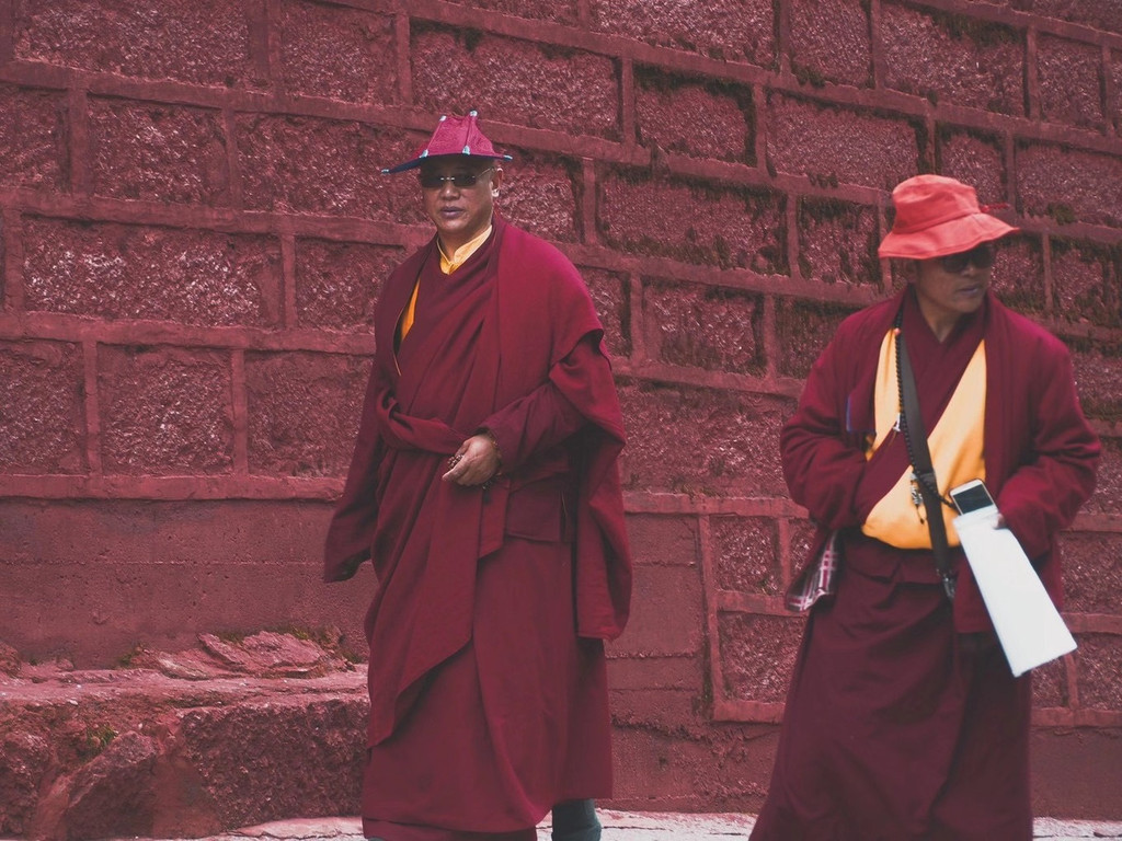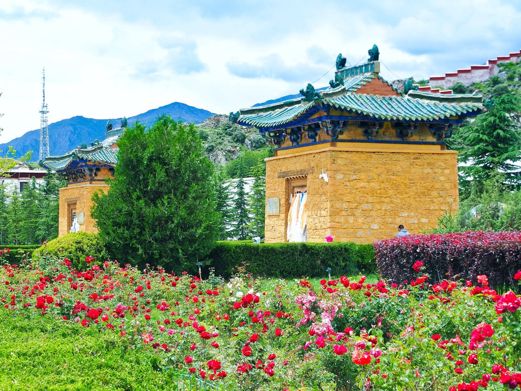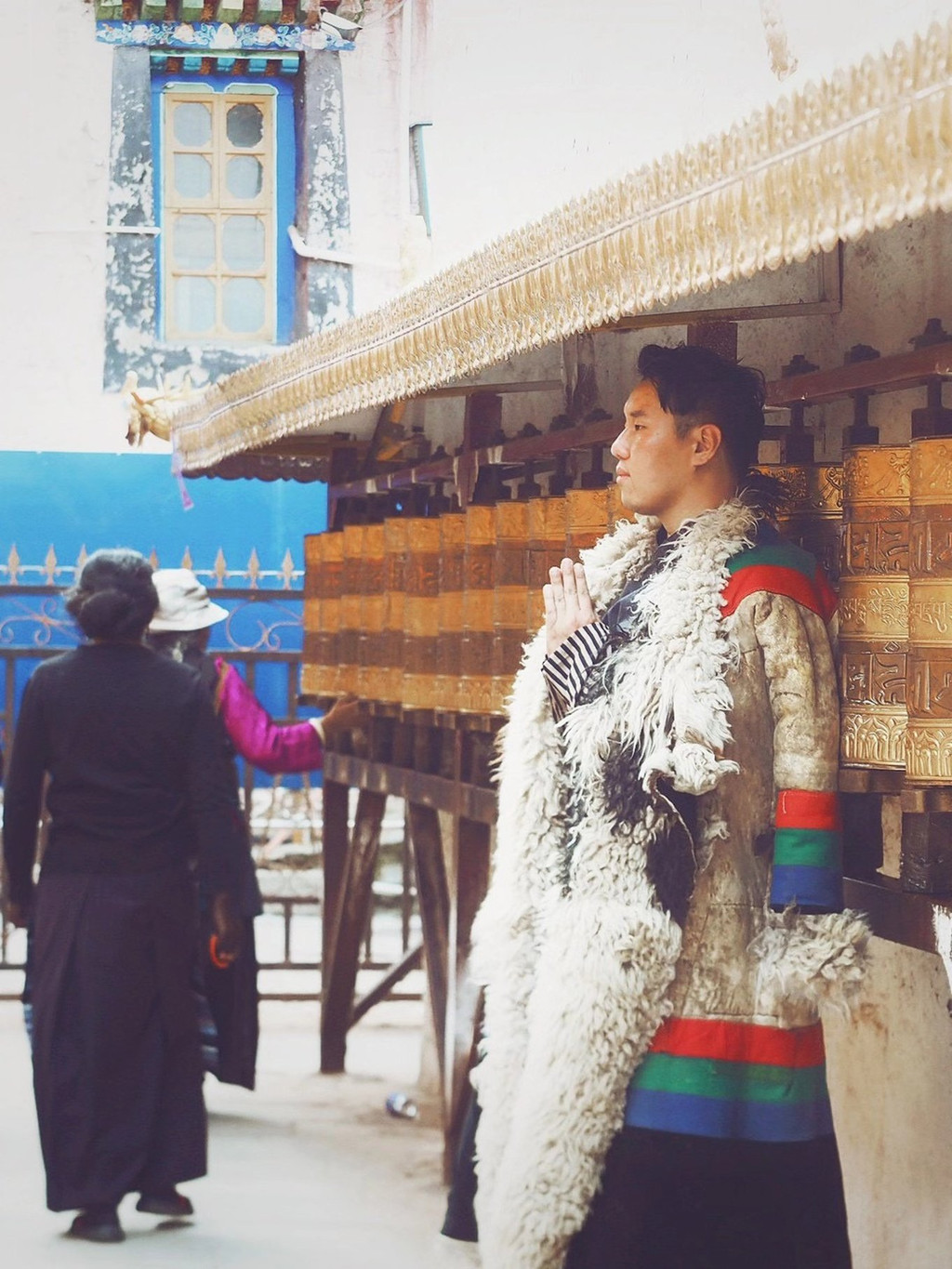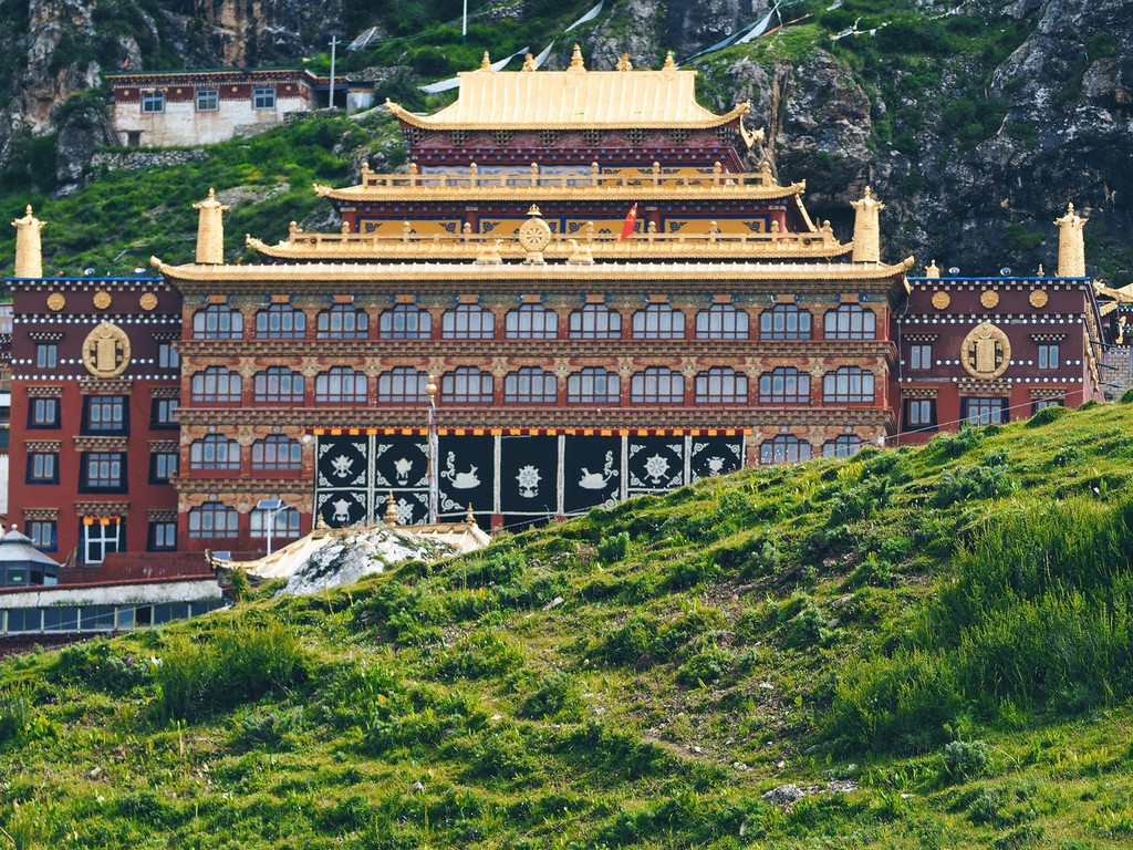 站在孜珠寺对面的观景平台上近赏孜珠寺,朱红色的宫殿被星罗棋布的屋舍环顾四周,而屋舍之后就是那如同六叶莲花瓣的孜珠山六峰,层层叠叠的庇护佑下,这座神圣的宫殿传来阵阵梵音,熙熙攘攘的喇嘛席地而坐,手里的转经筒更迭不息地转动着。