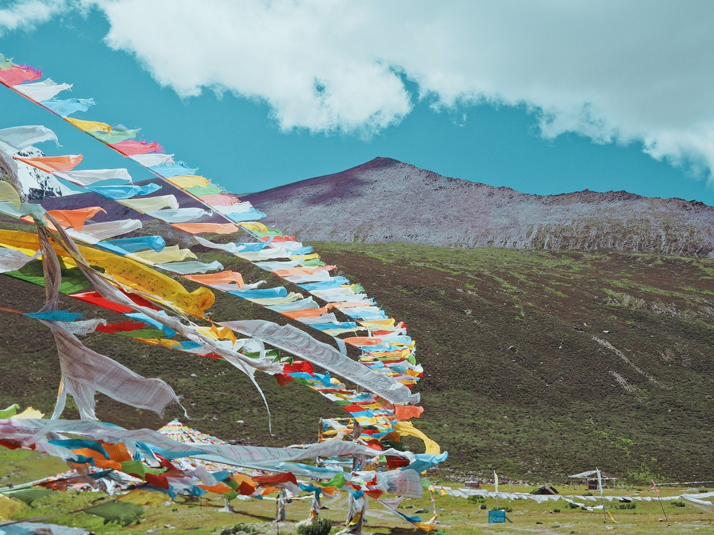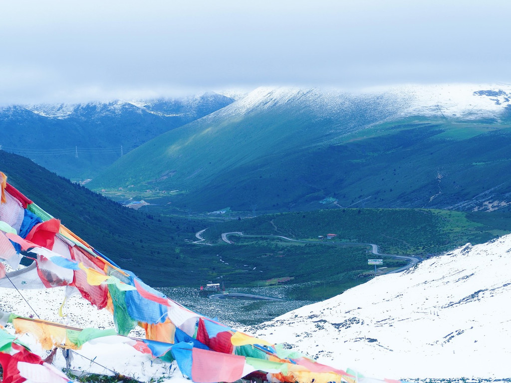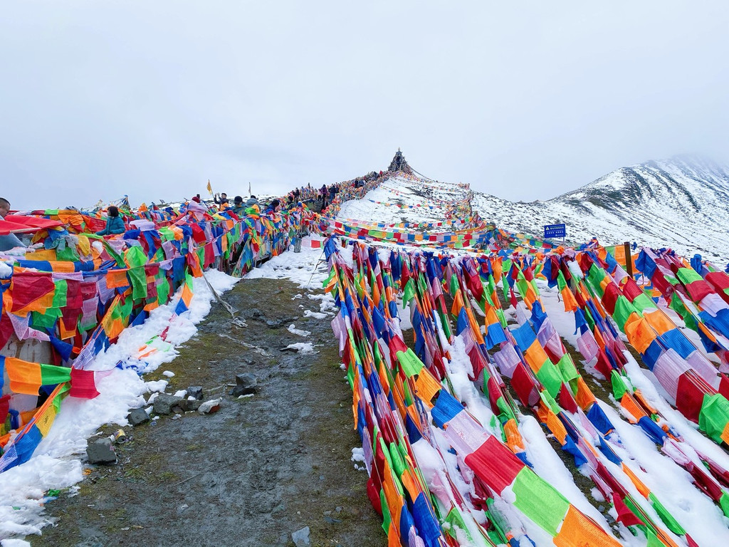 时隔一年,再次来到折多山,竟然变了个样。垂直向上的观景台台阶两侧围栏上,多一些经幡。当地还特意维修了一个经幡祈福地,供游客在折多山上寄托祝福。
