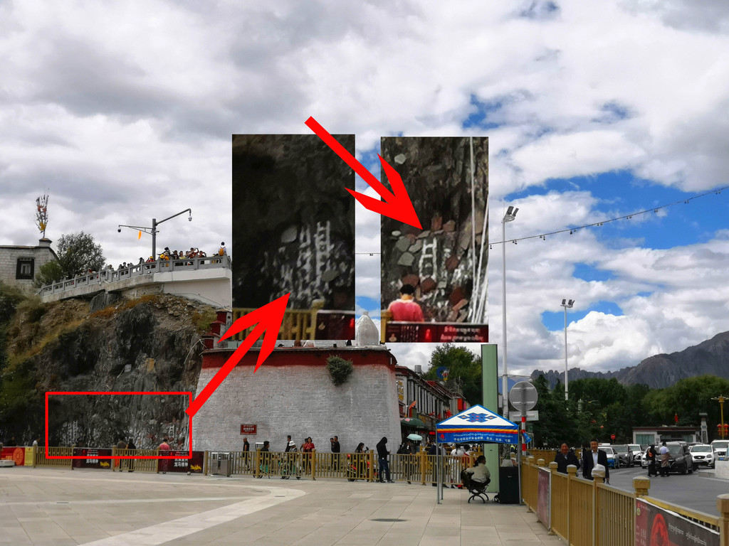 在西藏,尤其是拉萨通往各景点的公路边,往往可以在岩石峭壁上出现手绘的灰白色梯子图案。连布宫对面的药王山脚下都有。我们请教了当地人才得知那叫做“天梯”,是通往天国的梯子。是亲朋好友为那些在天灾人祸中消逝的生命升入天堂所准备的,男子奇数格,女子偶数格,画上通往天国的梯子盼他们早登极乐。听说这样的梯子通常画在水边,但我们看到的时候很多都不在水边了。我估摸着是因为这几十年来道路的建设把原本的“水”变成了“路”吧。