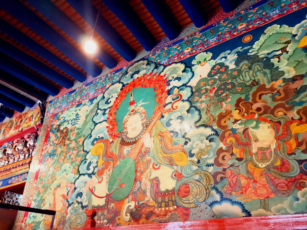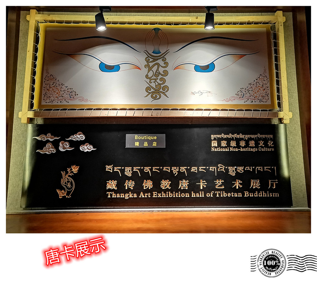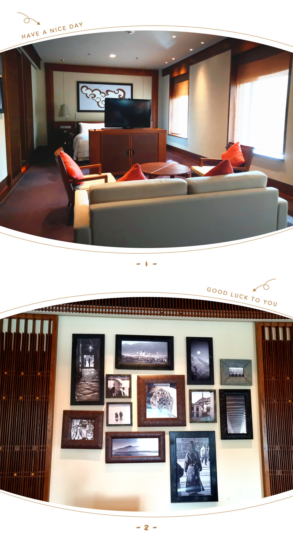爬上一个足以让人高反的陡坡,审阅完门口一字排列的沪牌豪车,我们终于到达酒店大堂。整个布置果然很有藏式风格,静谧且庄重。从大堂可以远眺布宫,酒店内部是庭院式的,一栋栋楼高高低低地错落着。大堂后面还有唐卡展欣赏。话说唐卡啊,制作是真精美,价格也是真不菲=。=另外,很可惜黄金泳池所在的楼在整体维修中,所以没法一睹真容了。