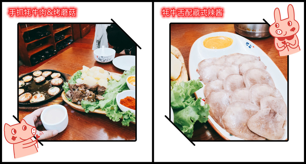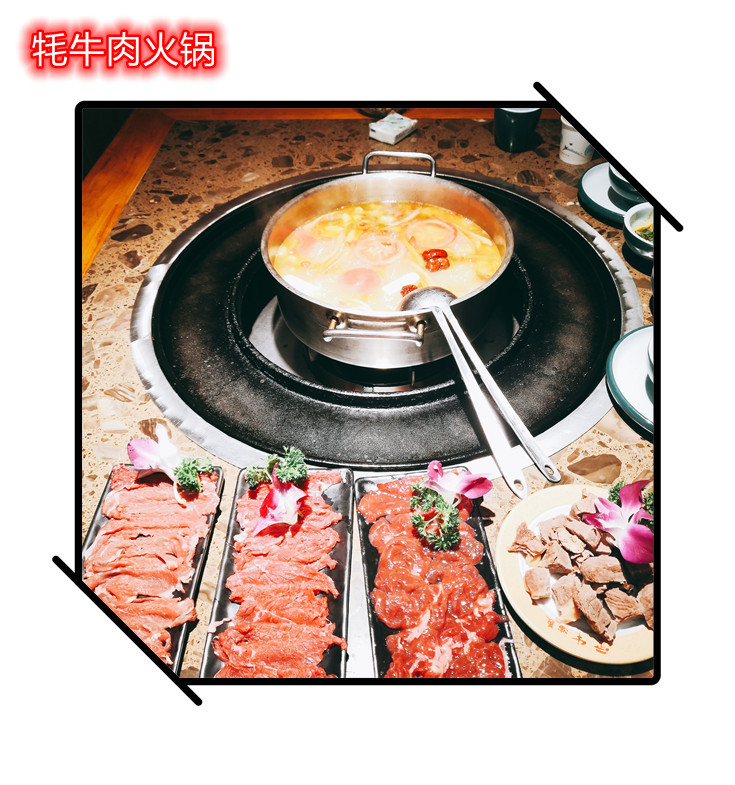 这是我们进藏的第一顿饭,手抓牦牛肉、牦牛舌、牦牛酸奶、烤蘑菇安排起~有童鞋问我吃不吃得惯?除了藏式辣酱有点怪怪,其他那些可太吃得惯了。牦牛肉本身比较老,所以都是用高压锅压制过才上桌的,可嫩了,美滋滋~赶脚这家店唯一的缺点就是地板黏嘎嘎滑哒哒,站着都可以滑走的那种……哈哈哈。。。