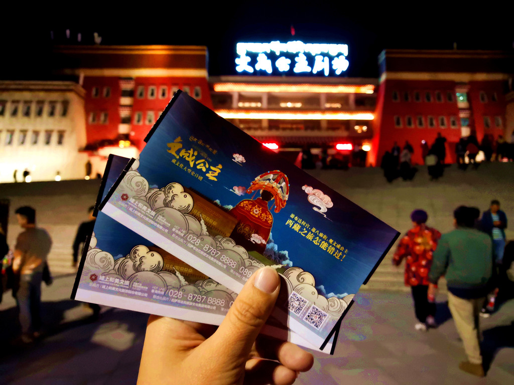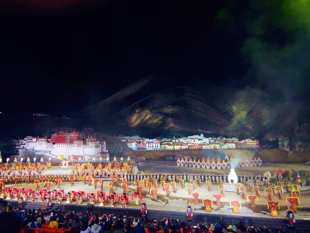 去丽江看了《印象丽江》,去重庆看了《印象武隆》,我还蛮喜欢这类实景演出的,气势恢宏,震撼人心。拉萨也有这样的演出,就是《文成公主》了。它讲述的是文成公主和亲松赞干布,从起行出嫁到恋恋乡愁到最后汉藏和美传播文化的故事。演出在拉萨河南岸的一座山的半山腰,没有公共交通。我们权衡之后决定预订车接车送的观影团。车子晚上7点半直接到酒店门口接我们去观看9点的演出,散场后送回酒店。车接车送一人30元的价钱还是可以接受的。事实证明此举是多么明智,很多自行从市区打车前来观看的游客散场后因叫不到车大规模滞留现场。