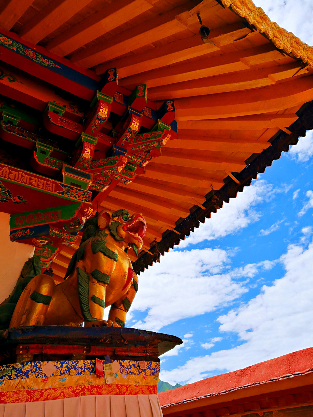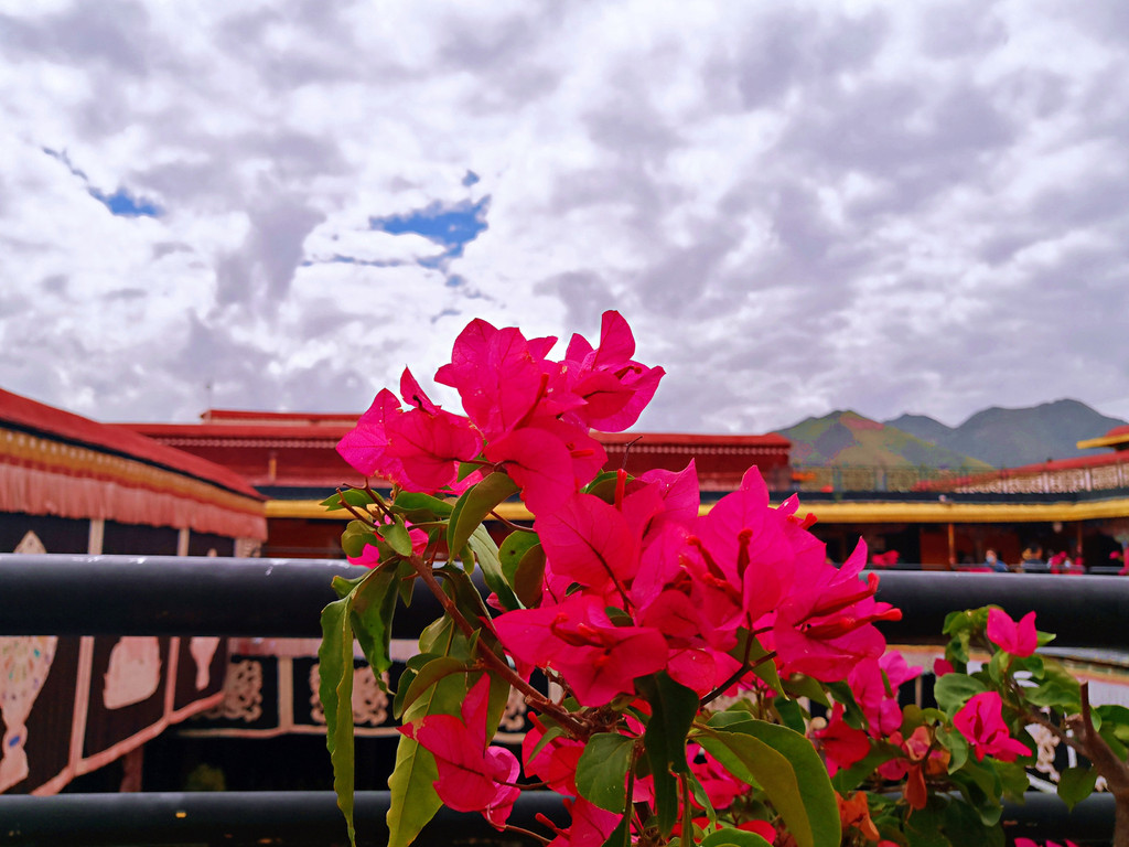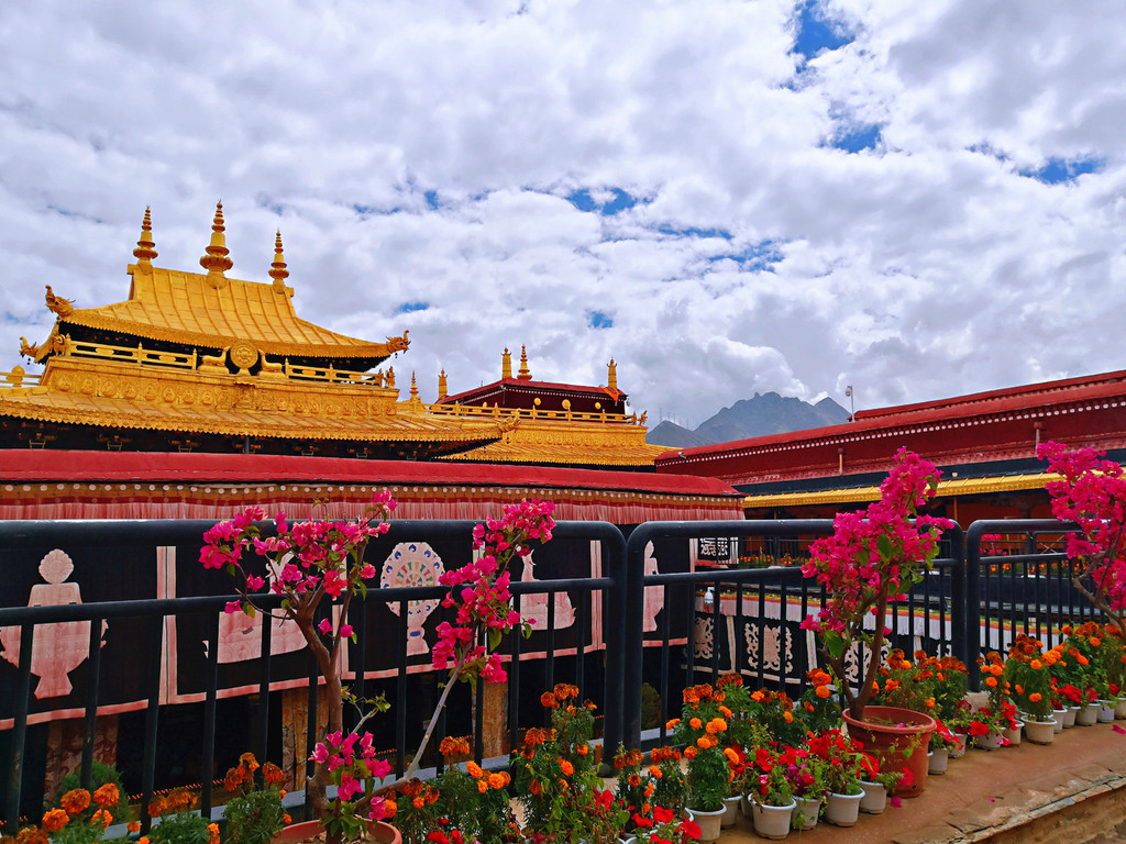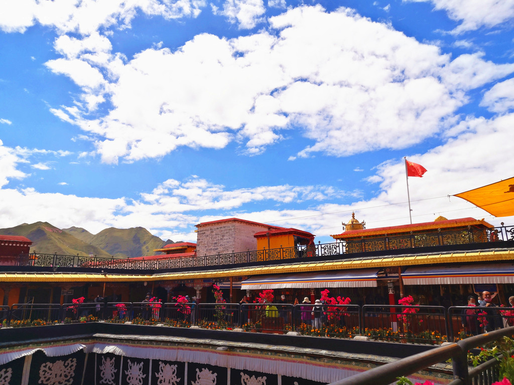 在二楼平台与金顶合影,可以说是来大昭寺参观的游客打卡的必备活动。蓝天白云,红花金顶,多好~据说三楼可以远眺布宫,但是我们去的那天三楼封闭无法进入,留了一丢丢小遗憾。
