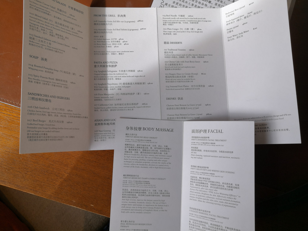 在房间里看到了服务菜单,我滴个乖乖啊……一块蛋糕138,一份素菜128,一碗素汤98,各色SPA一小时基本四位数的价格。不敢试不敢试。。。