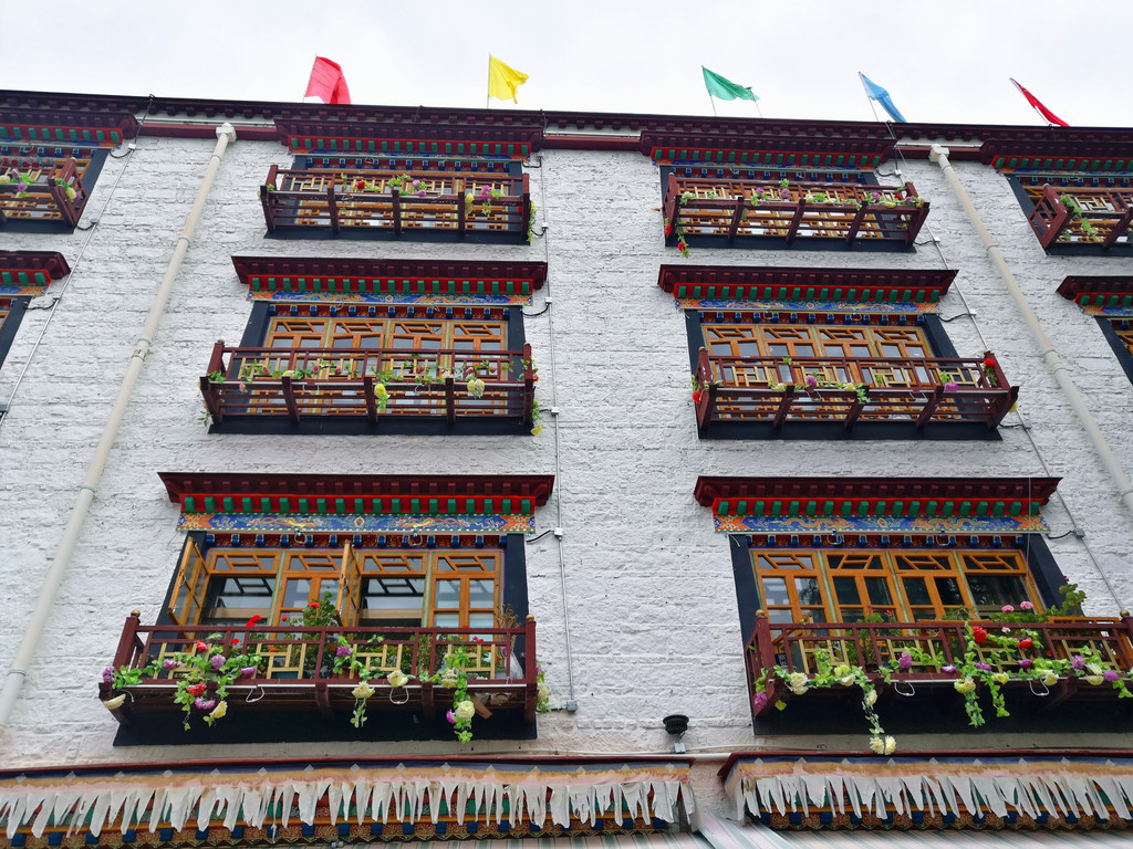 围绕大昭寺周围这一圈街道就是八廓街。八廓街又名八角街,据说早在古代的时候就是最繁华的商业街,直到现在保存的都非常完好,街道两边散落分布着不少民居,窗台上依旧是鲜花朵朵。