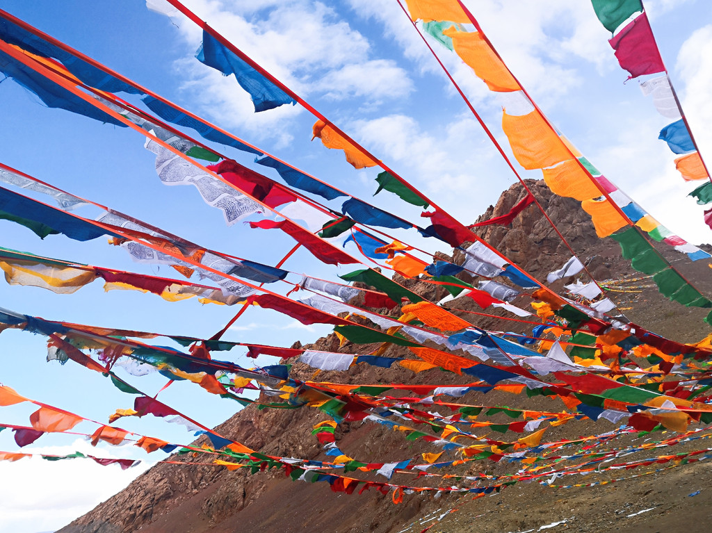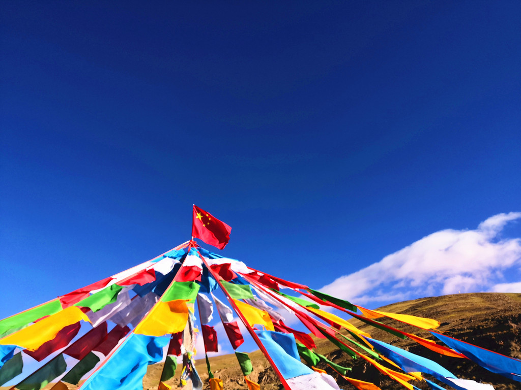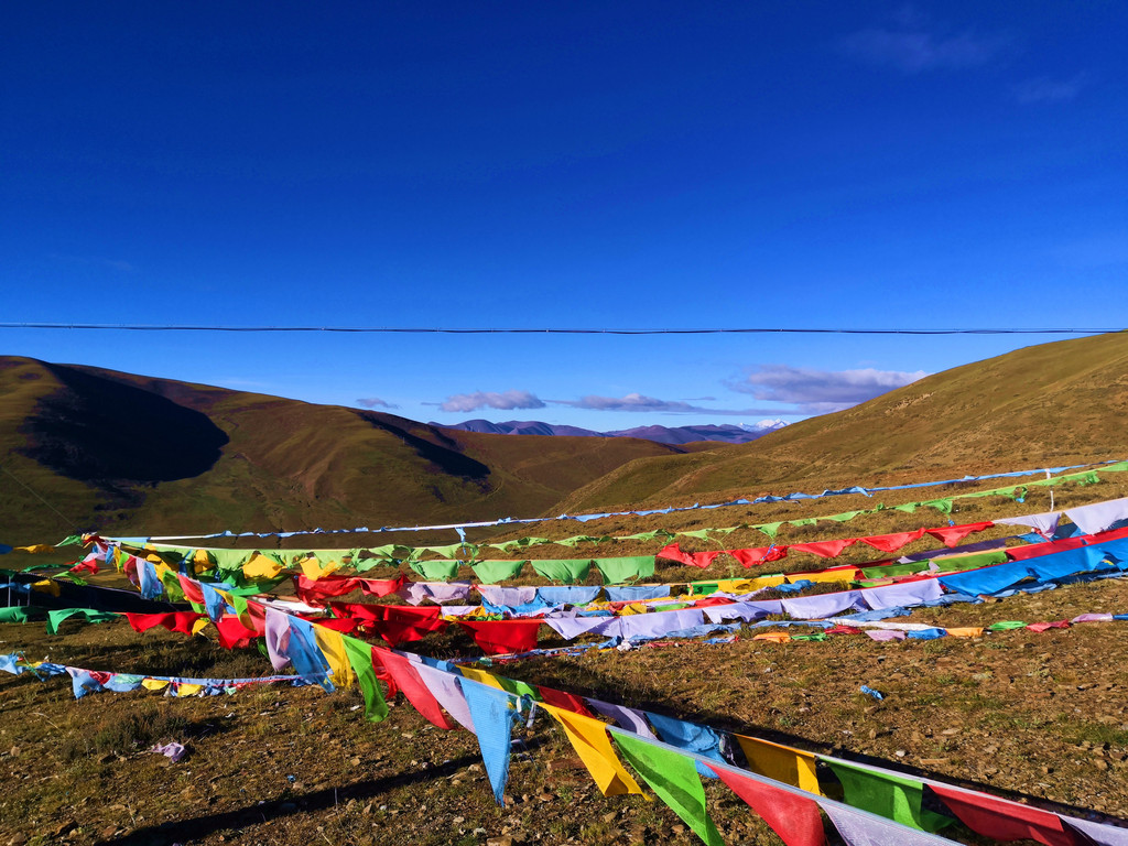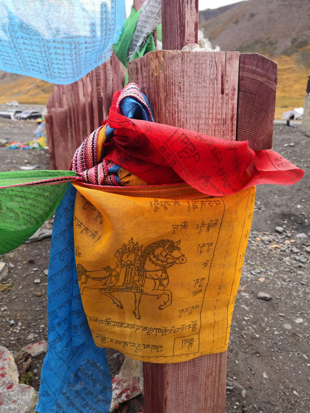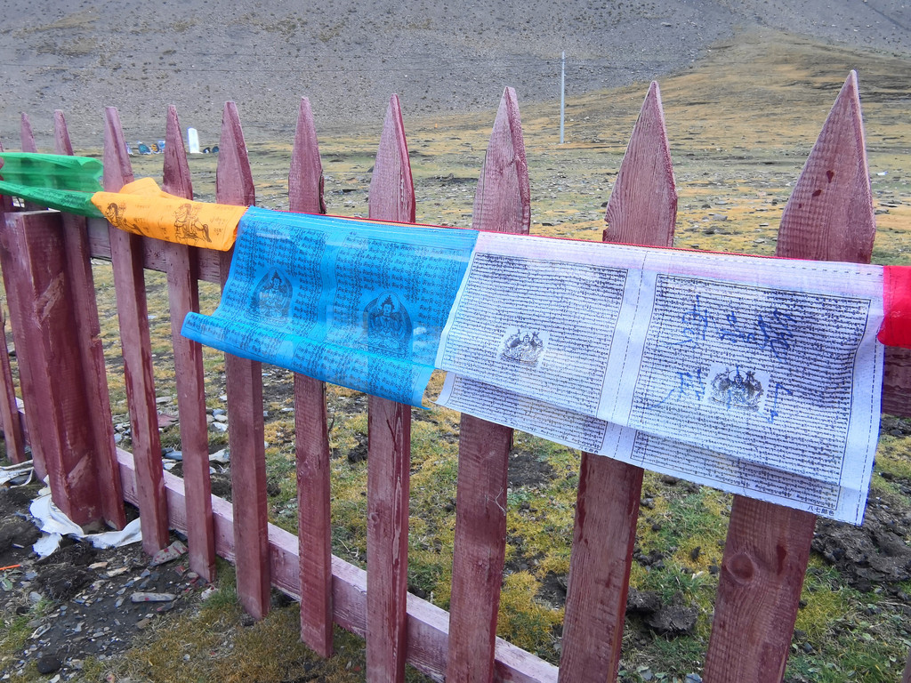 旺青说山口这些五彩经幡不能跨,更不能踩,如果挡路了你只有两种选择,要么绕过去,要么把他举过头顶从下面钻过去。这就是他们的信仰。据说之前有2个汉族小伙不尊重经幡差点引起了斗殴。