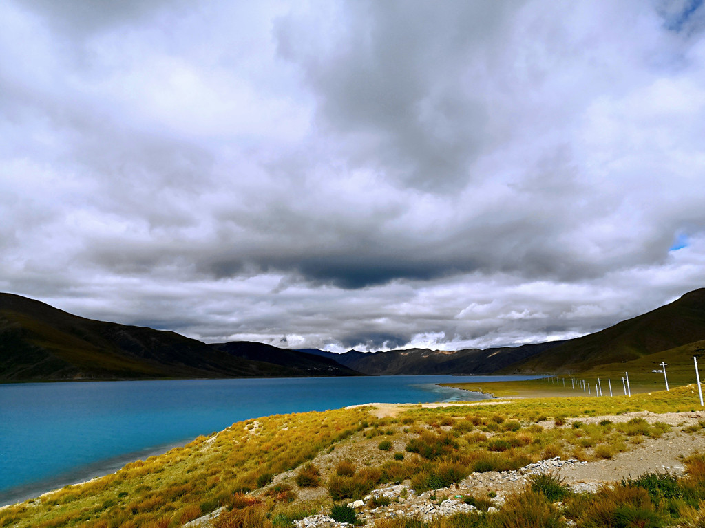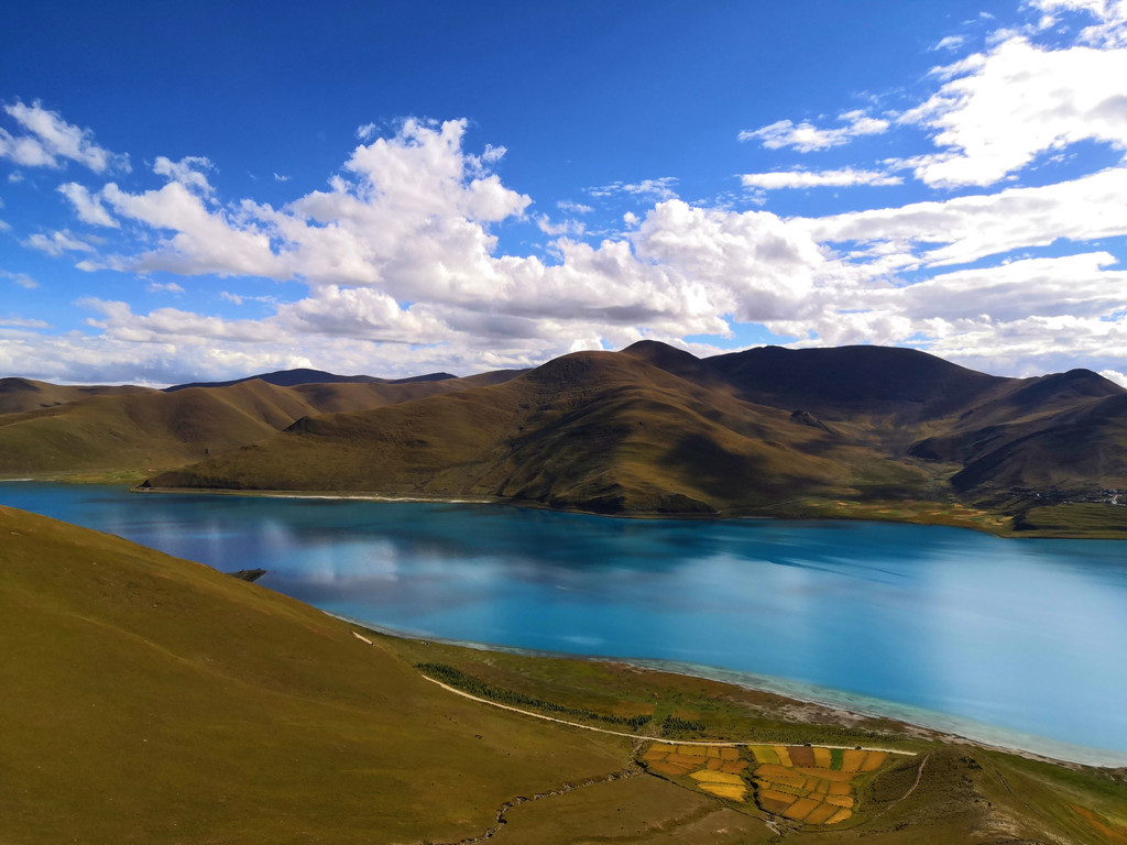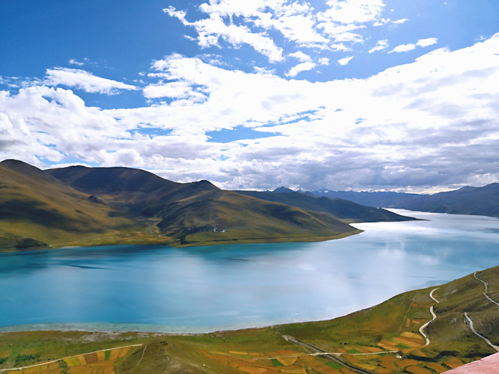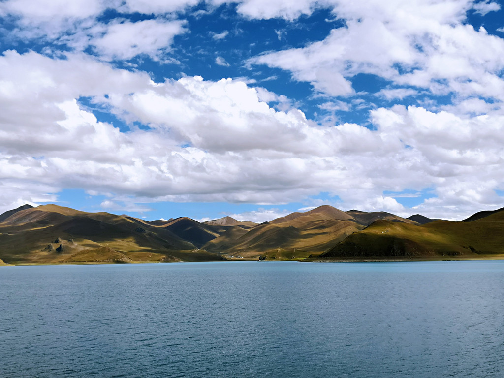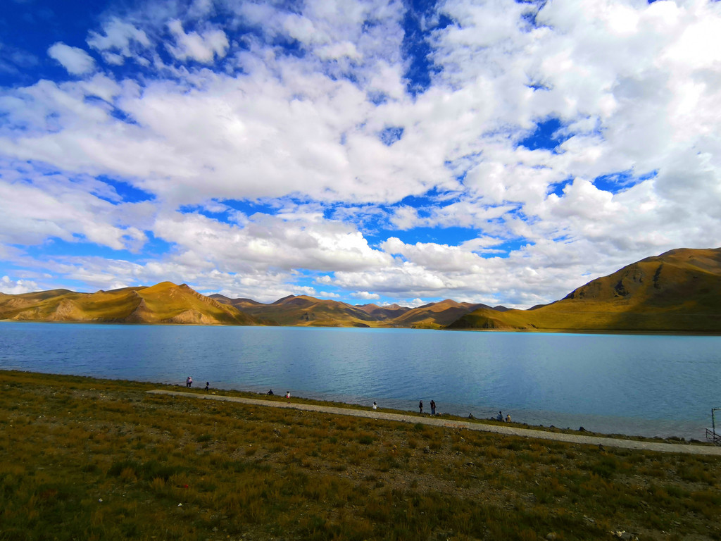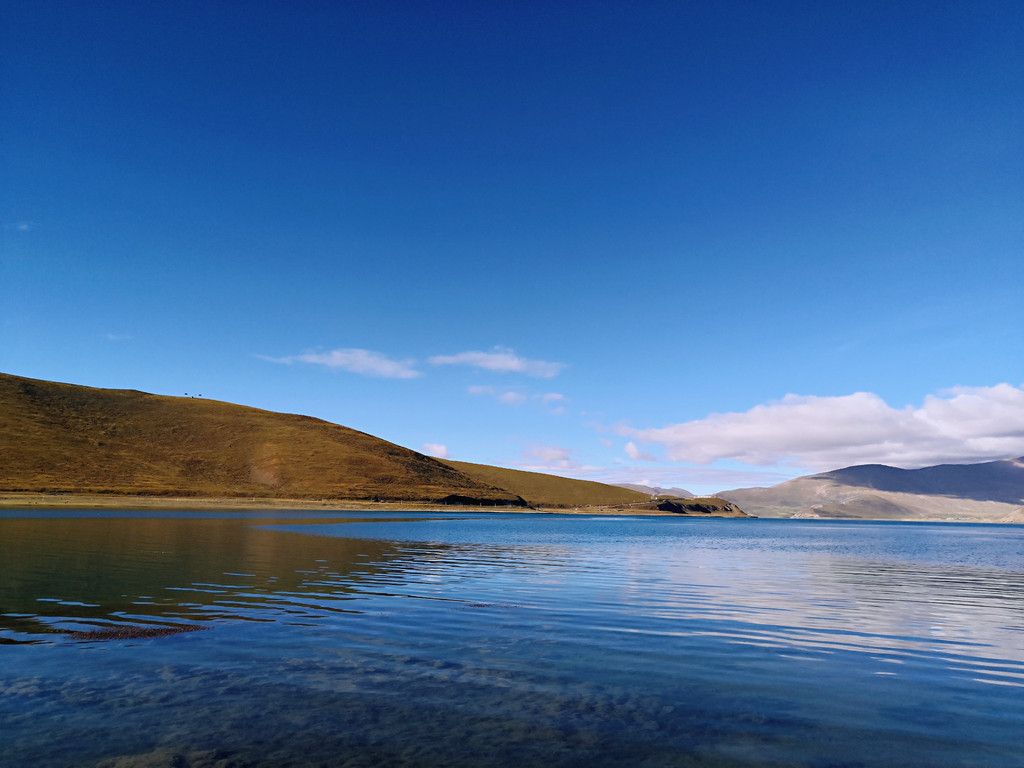 午后,太阳终于舍得上班了,才让羊湖恢复了靓丽本色。我们到第三个观景台看到眼前的羊湖,4个字:叹为观止。我想,这才是真正的羊湖吧!蓝!一碧如洗的蓝!我们拾级而下,仿佛一瞬穿越到了仙境。这一抹蓝蜿蜿蜒蜒像绸带般点缀在两岸青山中,漫天卷地的,在阳光下熠熠生辉。难怪有“天上的仙境,人间的羊卓;天上的繁星,湖畔的羊群”的说法。